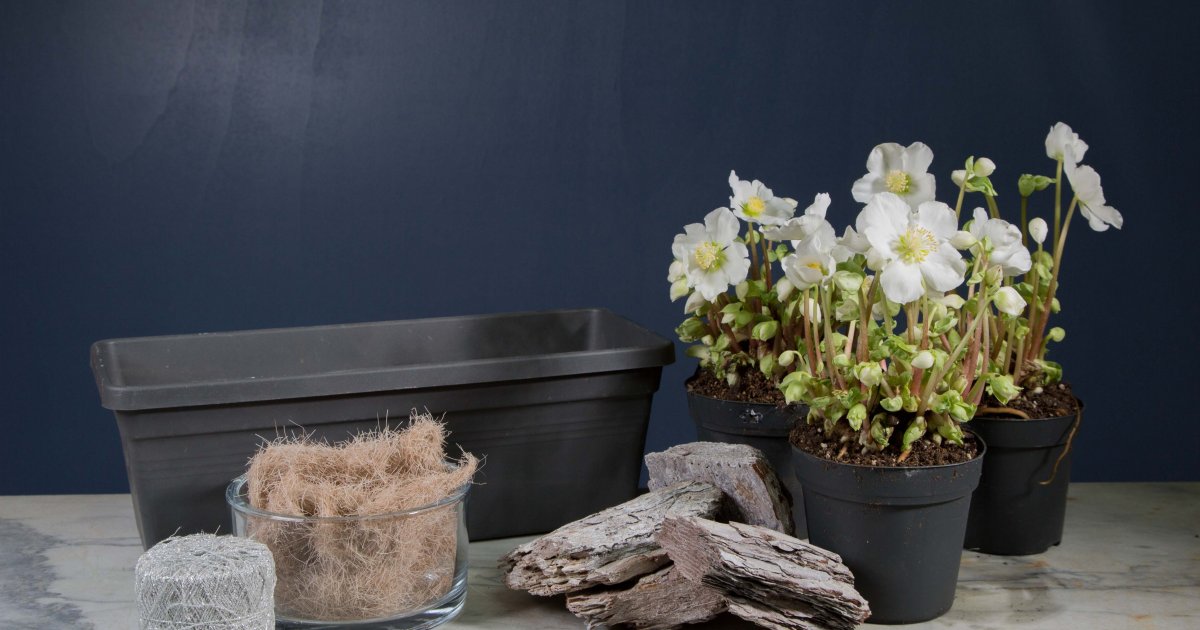 Three Hellebore 'Verboom Beauty', a rectangle container, soil, pieces of bark, sisal and silver thread. Keep a knife and hot glue gun within reach.