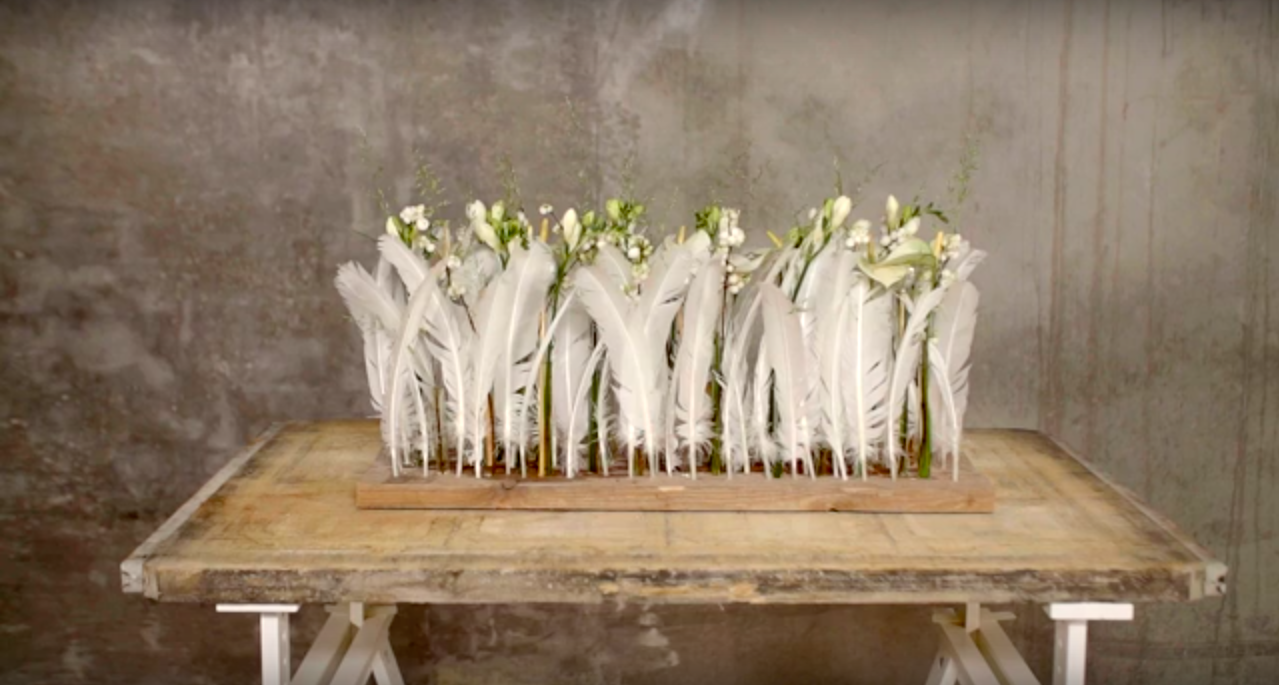 Freesias, Anthuriums and feathers are the main components of this beautiful white Christmas flower arrangement. Alex Segura shows you how relatively easy you can create this stunning design!