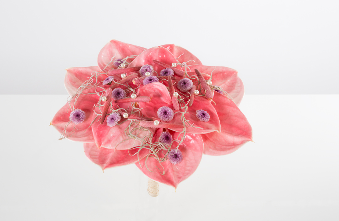 An idea for a wedding bouquet with Anthurium. For a playful effect, Pim van den Akker cut the spadix and re-pinned it with pearly pins. Extra detail: glued little Chrysanthemum flowers and Tillandsia.