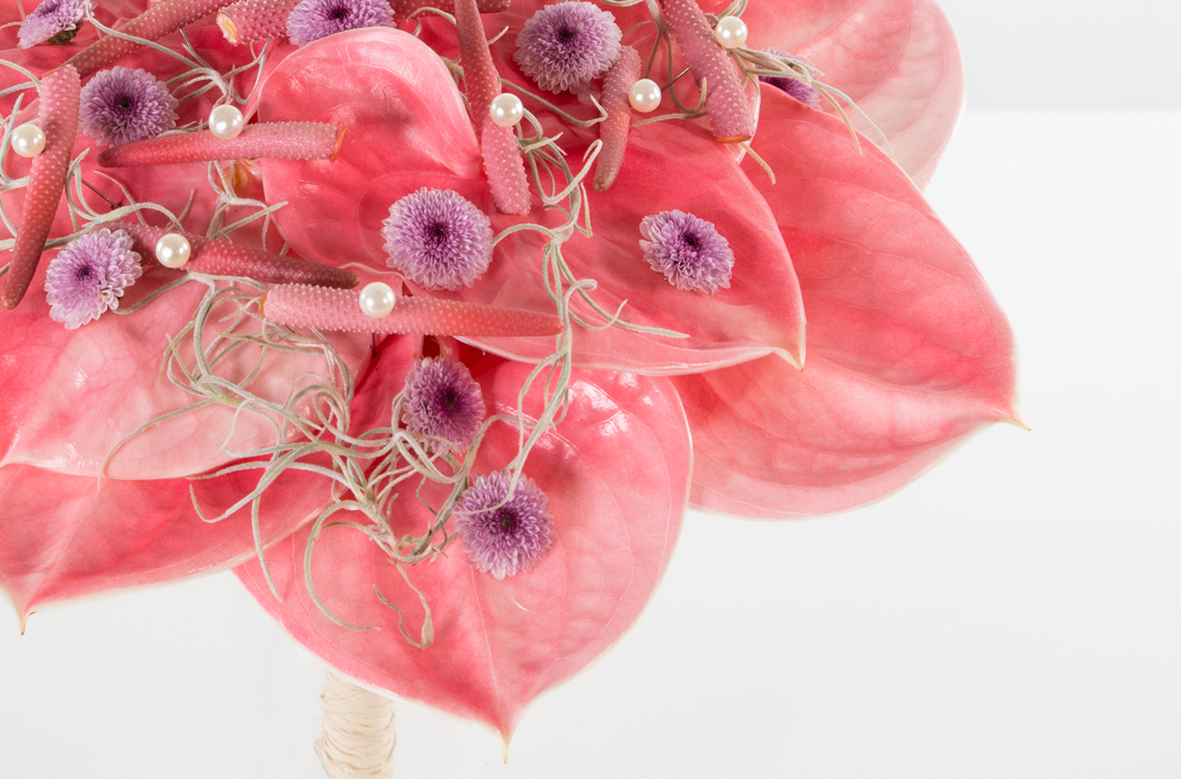 An idea for a wedding bouquet with Anthurium. For a playful effect, Pim van den Akker cut the spadix and re-pinned it with pearly pins. Extra detail: glued little Chrysanthemum flowers and Tillandsia.