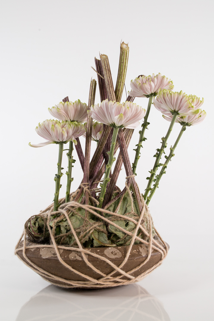 Idea by Pim van den Akker for a cool floral base: use butterbur leaves, tie teach leave into a ball with some rope and place them upside down in a bowl. Clamp the Chrysanthemums in between. In this case Pim used the 'Rossano Charlotte' from Deliflor Chrysanten. Watch his vlog with this arrangement here