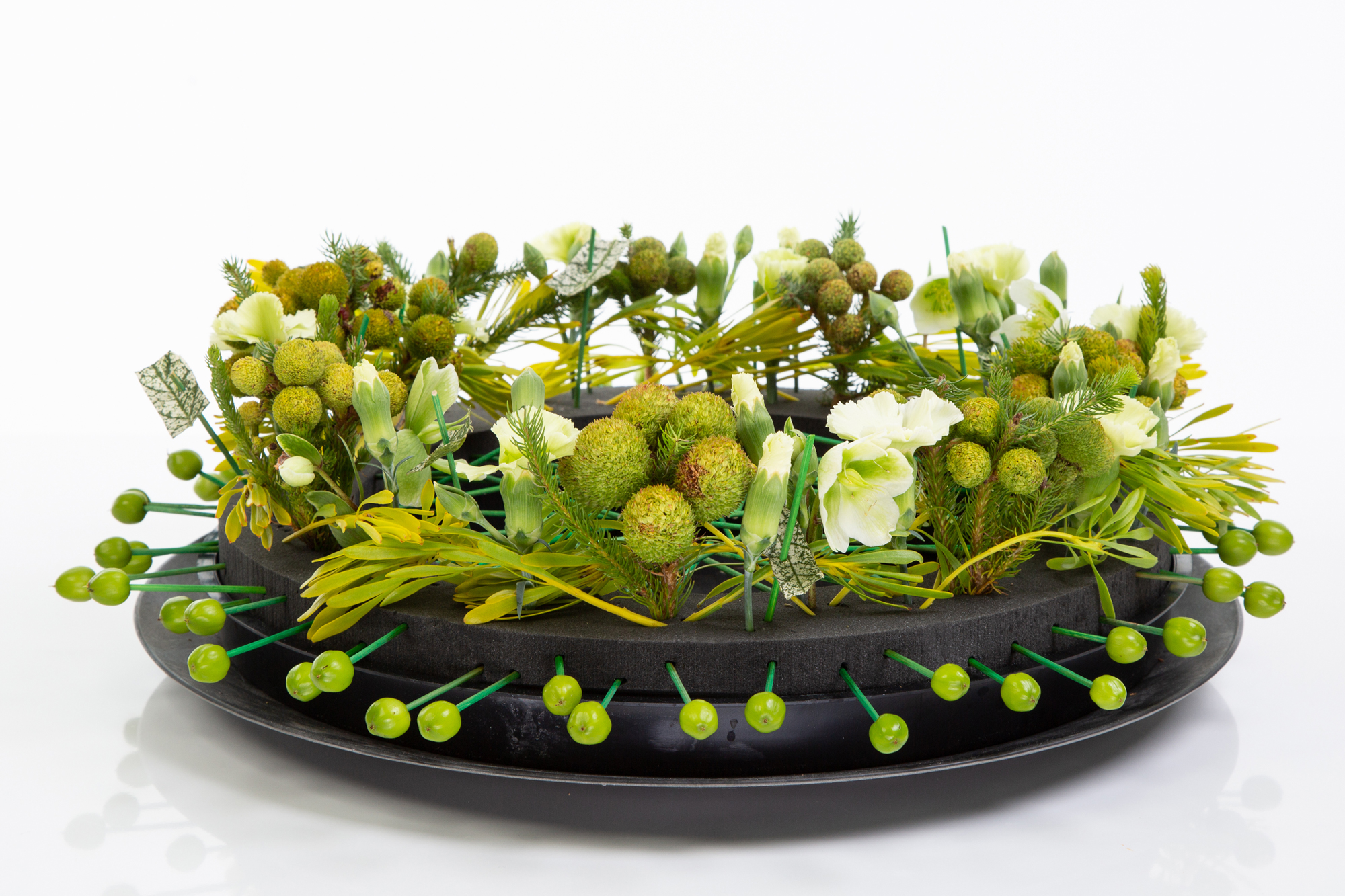 An OASIS® Black Ideal floral foam ring is the base for this subtle green flower wreath by Roos van Unen. As the black foam may be seen, it's is just lightly covered with carnations, Brunia Albiflora and pieces of green wicker on which Hypericum berries have been pierced.
