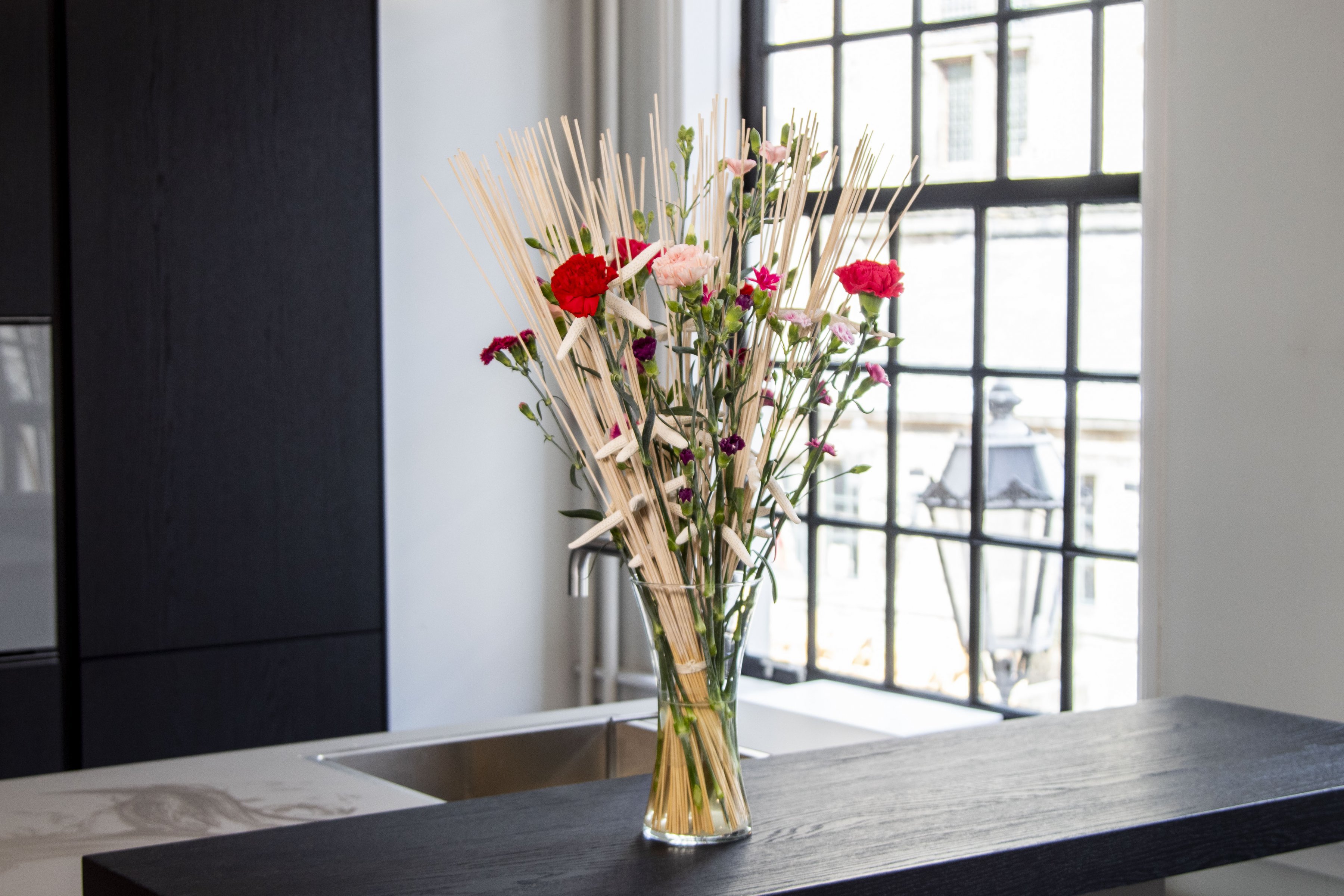 Deze tutorial geeft je inspiratie om een mooie bijzondere bos bloemen op tafel te zetten met de anjer als ster van het boeket. Roos van Unen laat je zien hoe je met rotan stokken je boeket een heel andere look geeft.