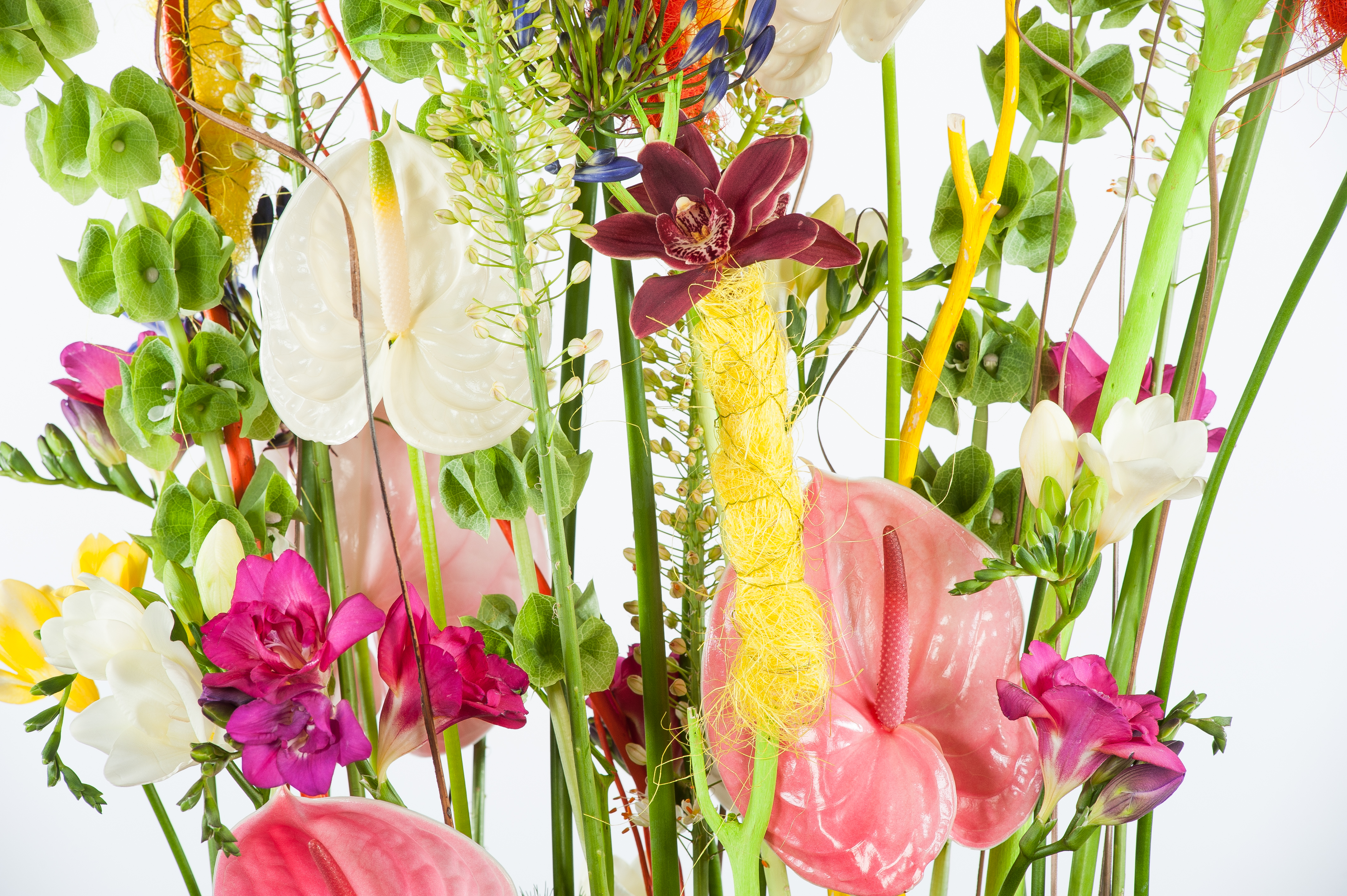 A summery combination with Anthurium 'Moments', Freesia, Molucella, Cymbidium and Agapanthus