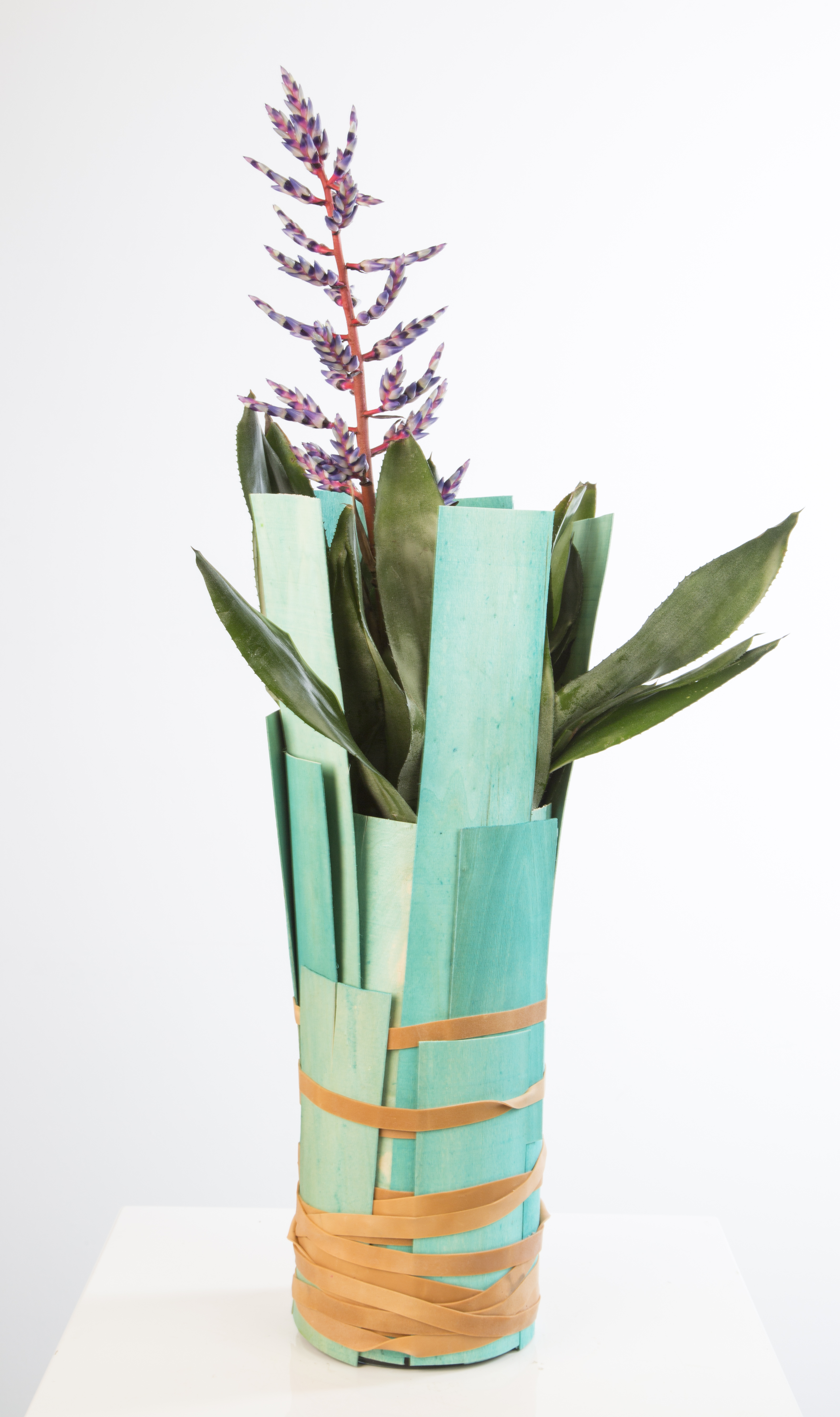 Voor een kleurrijke bromelia een vrolijk jasje, bevestigd met elastiek.