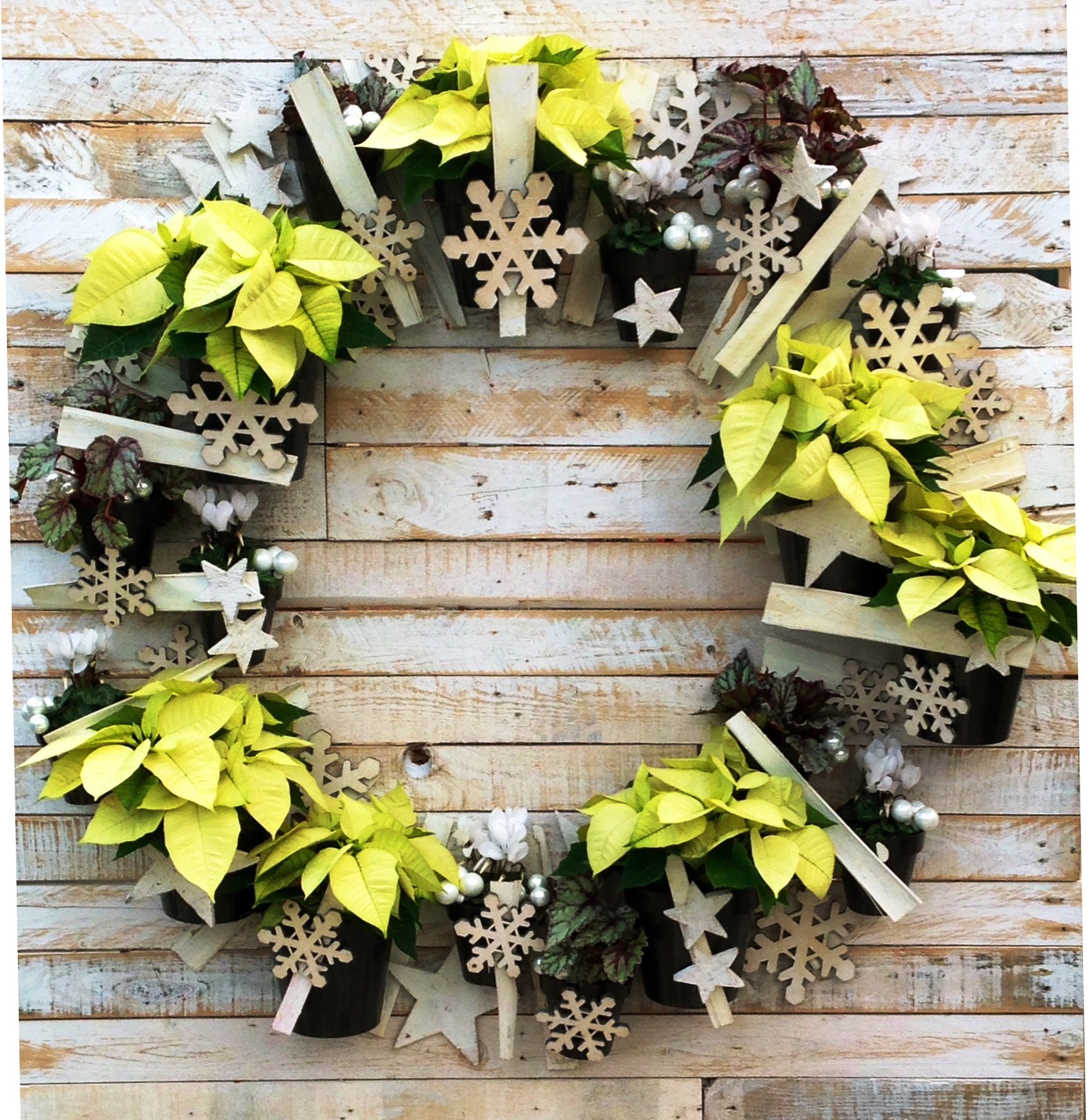 De houten kerststerren en het fineer geven de krans een moderne twist.