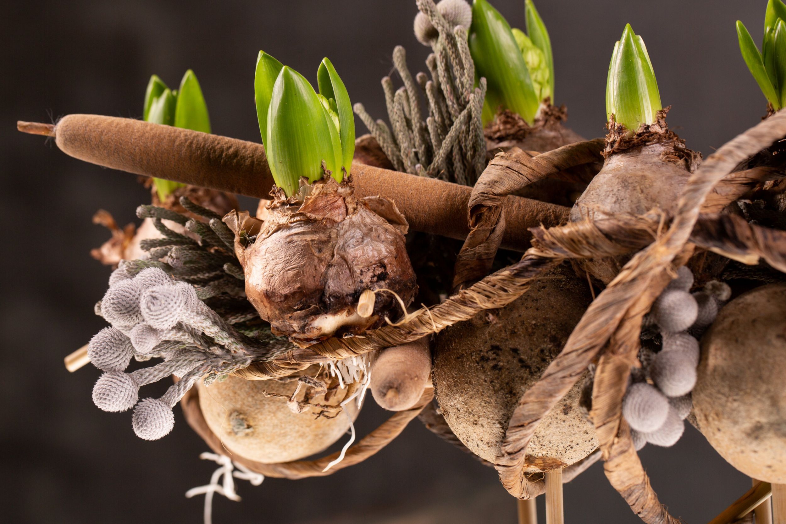 The Hyacinthus bulbs and Amaryllis bulbs give this composition a festive look. Finish it off with dried fruit like wood apples, Thypha and Brunia. That gives this centerpiece a winterly look and feel. The bulbs and materials are all from Bab Star.