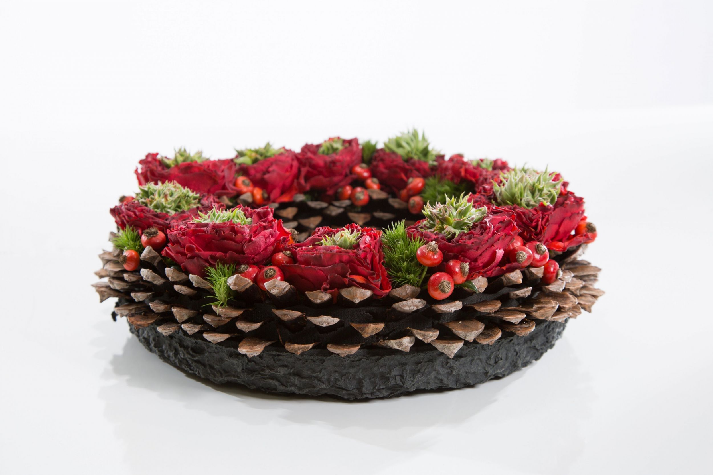 Christmas wreath idea with black foam by Roos van Unen. She experimented with the Black BIOLIT wreath from OASIS and created a Christmas design using just a few materials; with beautiful roses, pieces of pinecone, some moss and berries. Cool isn't it?