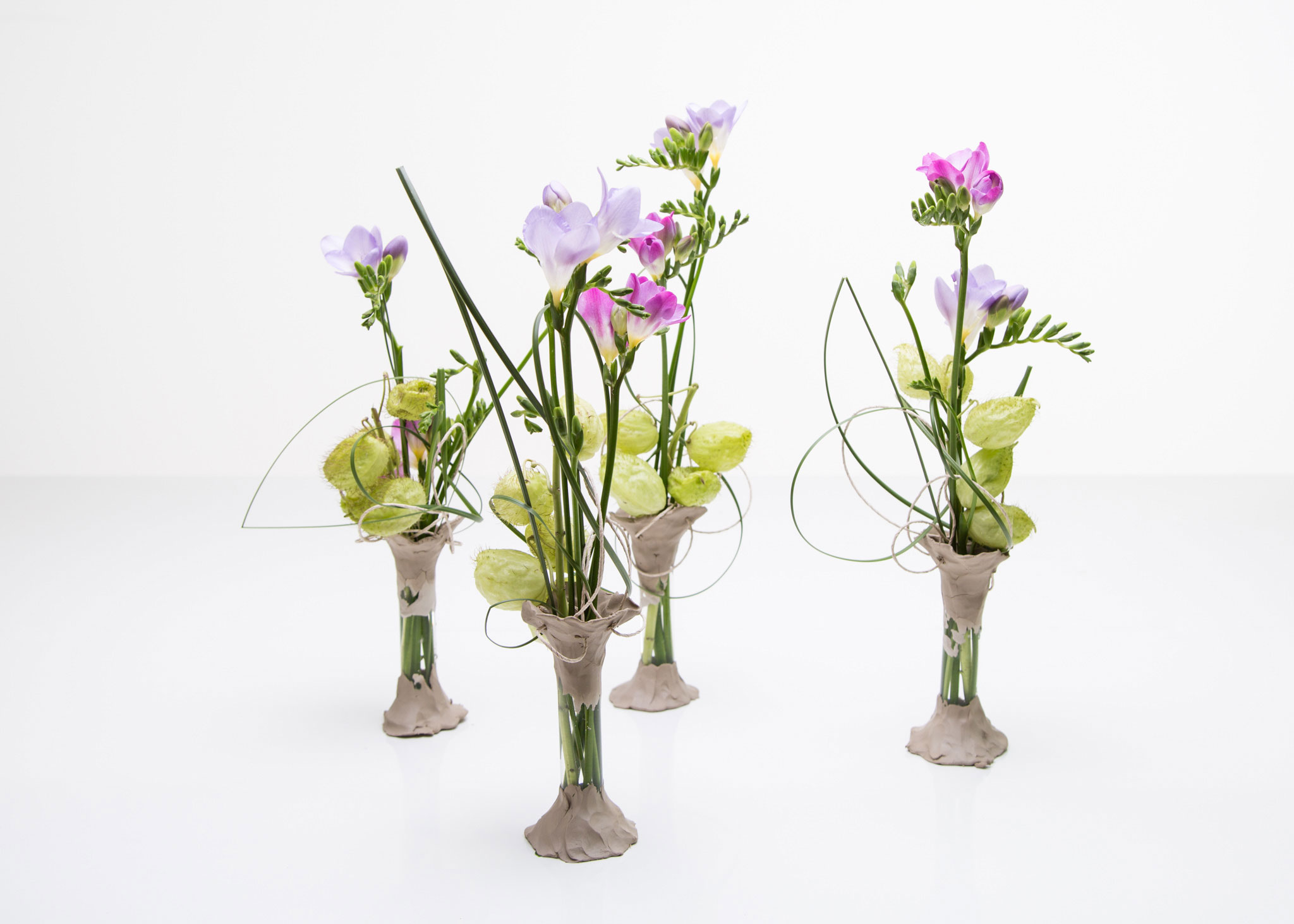Kristel van Dijk packed glass tubes in clay for a different look. Perfect for purple Freesias.