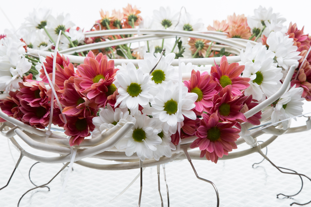 A design derived from the DIY style mood board for Zentoo: Roos van Unen created a shape out of clothes hangers which she tied together with tie-wraps. The hangers hold a glass bowl, filled with the pretty pink Grand Cherry spray Chrysanthemum and white Bouncer Santini. Super original!