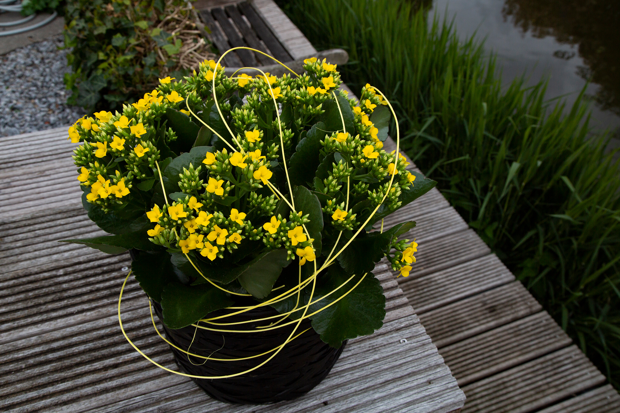 Bright yellow Kalanchoë in a black basket. Sometimes it can be that simple. As an extra detail, Pim van den Akker added yellow wicker to compliment the flowers. Would you like to see more ideas with Kalanchoë? Watch the livestream via this link.