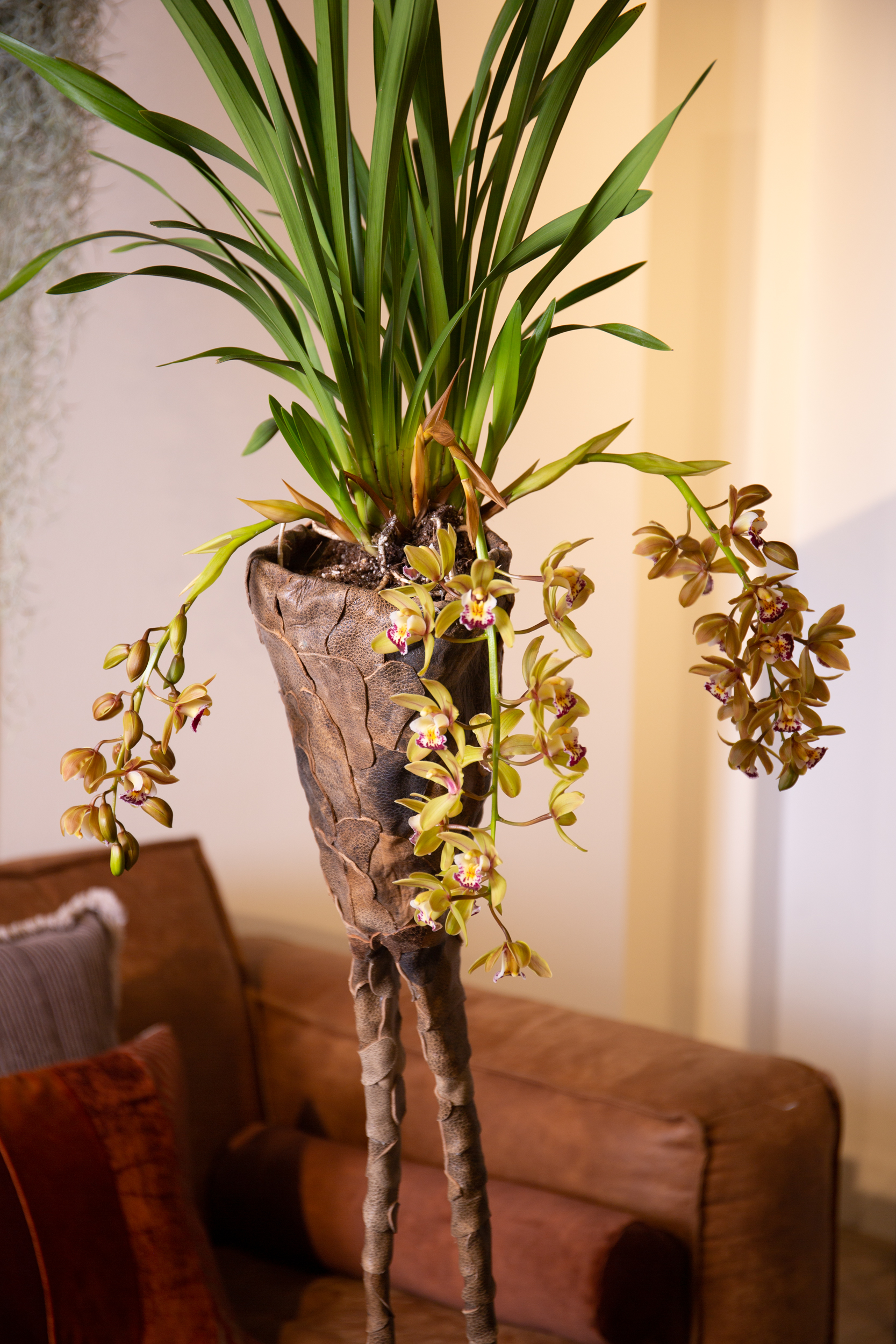 The Cascade Cymbidium 'Argiro' from LZ Orchidee is a jewel to add to your interior and fits well with a tough style. The special 'cascade' of flowers and the upright leaves give the Cascade Cymbidium her iconic shape. These qualities invite you to accentuate in your designs. Pim van den Akker created a standing base with chicken wire and a pot, which he then covered with pieces of leather.