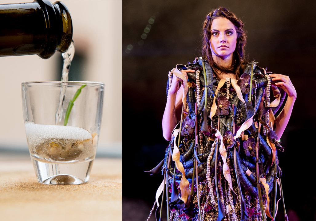 This creation by floral designer Pim van den Akker is made of grinded lichen with a rubber base, threaded fruits and dried kelp. By using dark colored Calla’s, Scabiosa and Cymbidiums this design has a dramatic feel to it. Chef Yuri Verbeek made a vogole (clam) with sage, Salicornia Cress and wine from Domein Aldenborgh to accompany this presentation.