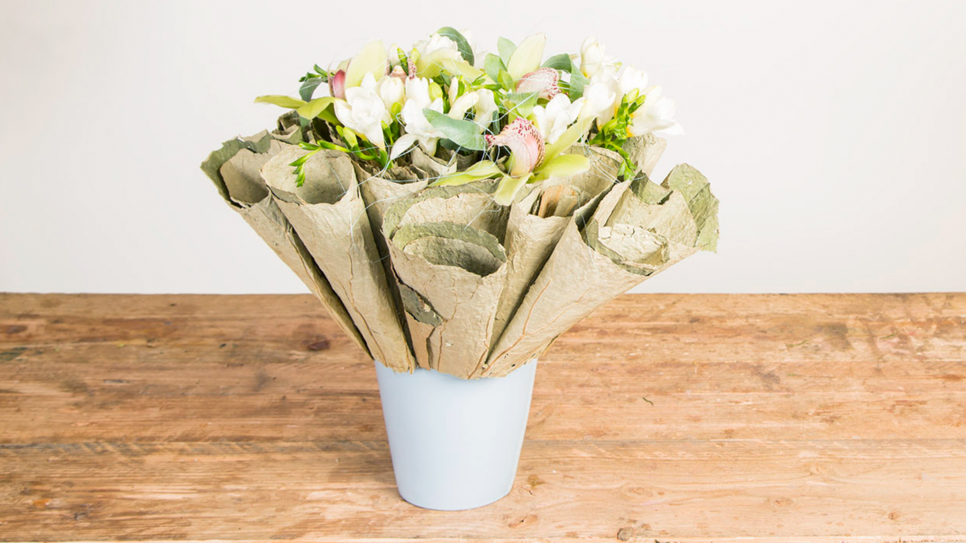 Alex Segura creates an unique flower arrangement with dried Lotus leaves, Freesias and Cymbidiums.