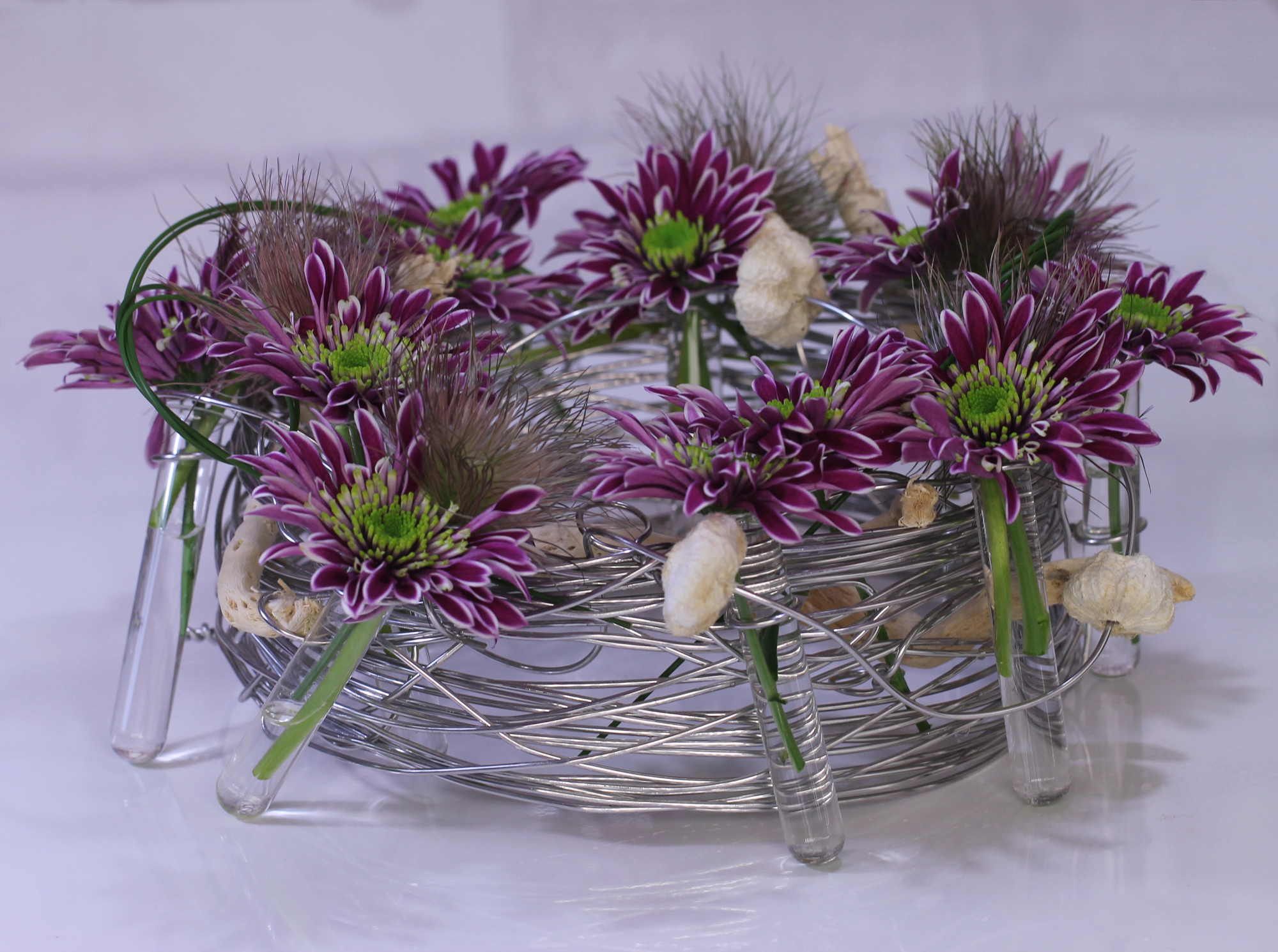 This chrysanthemum had a white line on the edge of her flower leaves, the iron wire has a great connection with the flower.