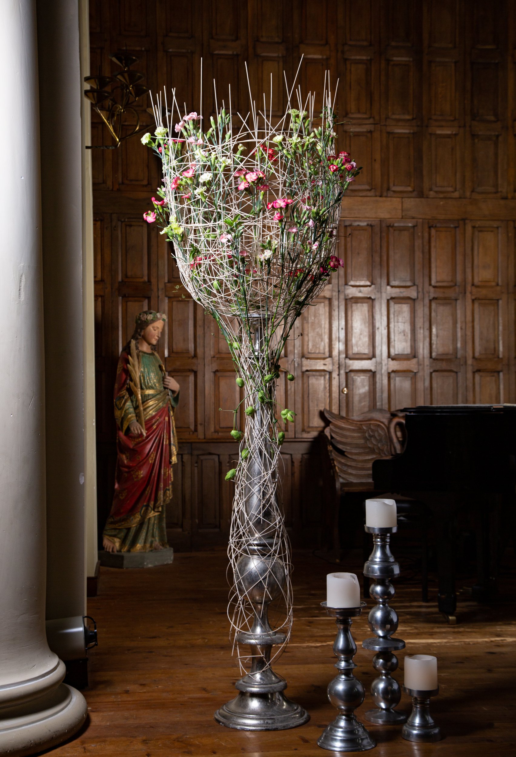 Colourful carnations are wonderful and strong flowers, perfect to use for wedding decorations! In this design by Pim van den Akker you can see different Sparkz varieties such as the Solomio® 'Bern', 'Fen' and 'Imre' in a nest-like object made out of wicker and placed on top of a big candle holder. An impressive floral piece to decorate the church with or to place outside, welcoming the guests. Easily reusable base, so you can invest some time in it!