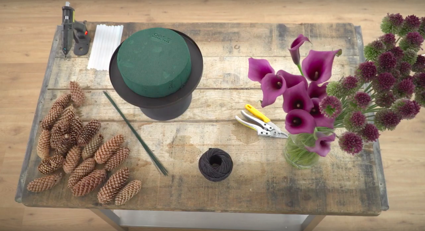 Pim van den Akker works with pine cones, floral foam and a black tray as a base for an autumn flower arrangement with Allium and Calla. He shows you a smart and original way to use ready-made products!
