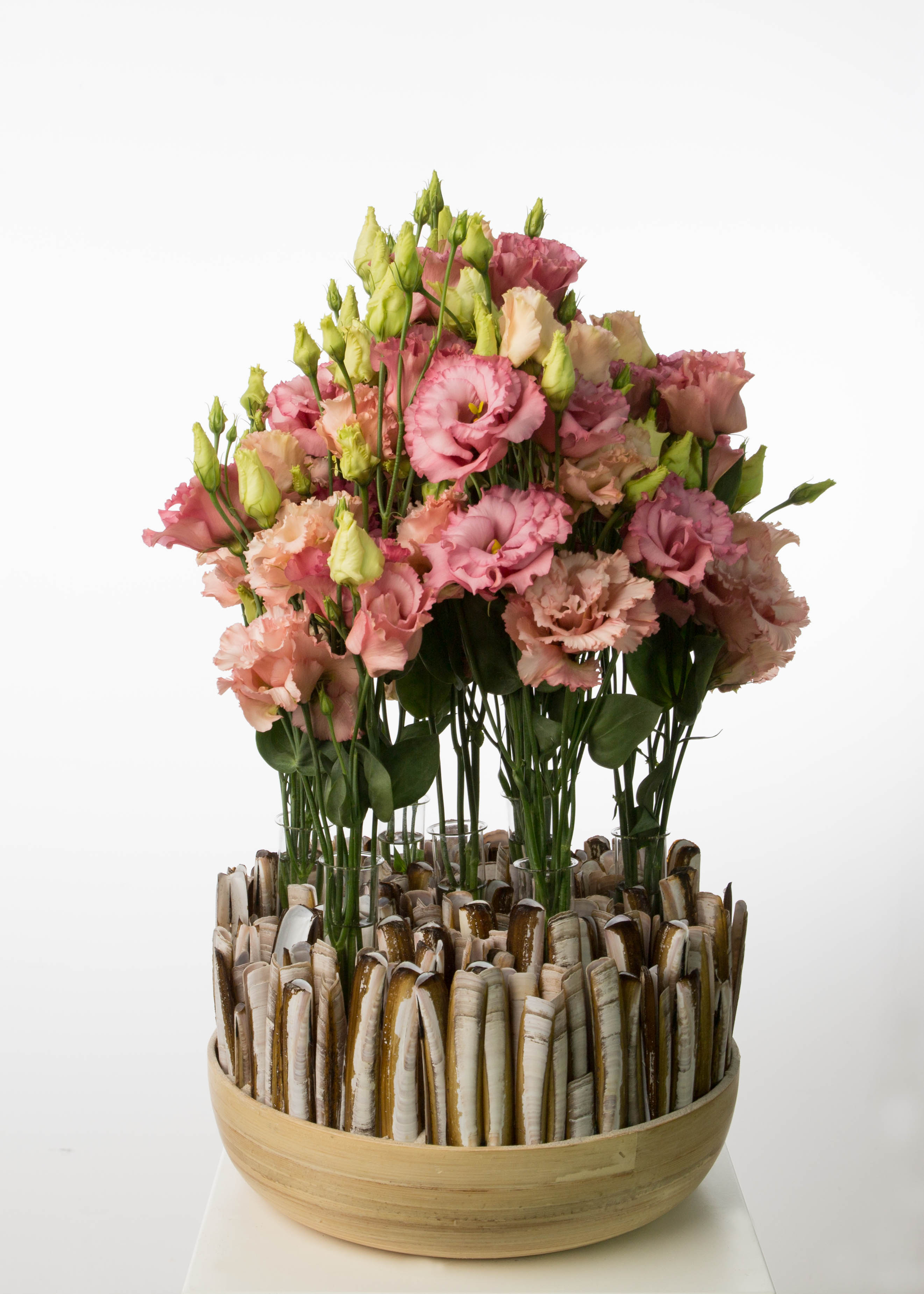 Aren't these Lisianthus peachy? Or rather apricotty as their names 'Corelli Apricot' and 'Alissa Apricot light' imply. Whatever fruit, we love their colour! They have been given a wonderful stage by Chantal Vollenbroek in her design based on razor shells. A perfect gift for moms who love flowers and beaches ;) Watch Chantal's video tutorial on this design!