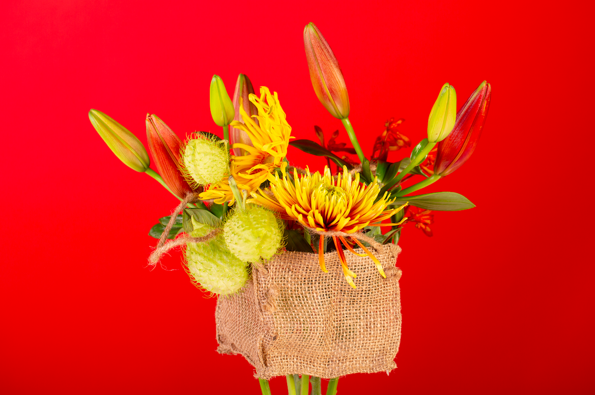 Pim van den Akker shares another quick and easy idea to present flowers in an original way. Many ready-made floristry articles can be turned into a frame for your flowers, like this little jute bag. Just pierce some holes in and placed the flowers through. Sweet gift!