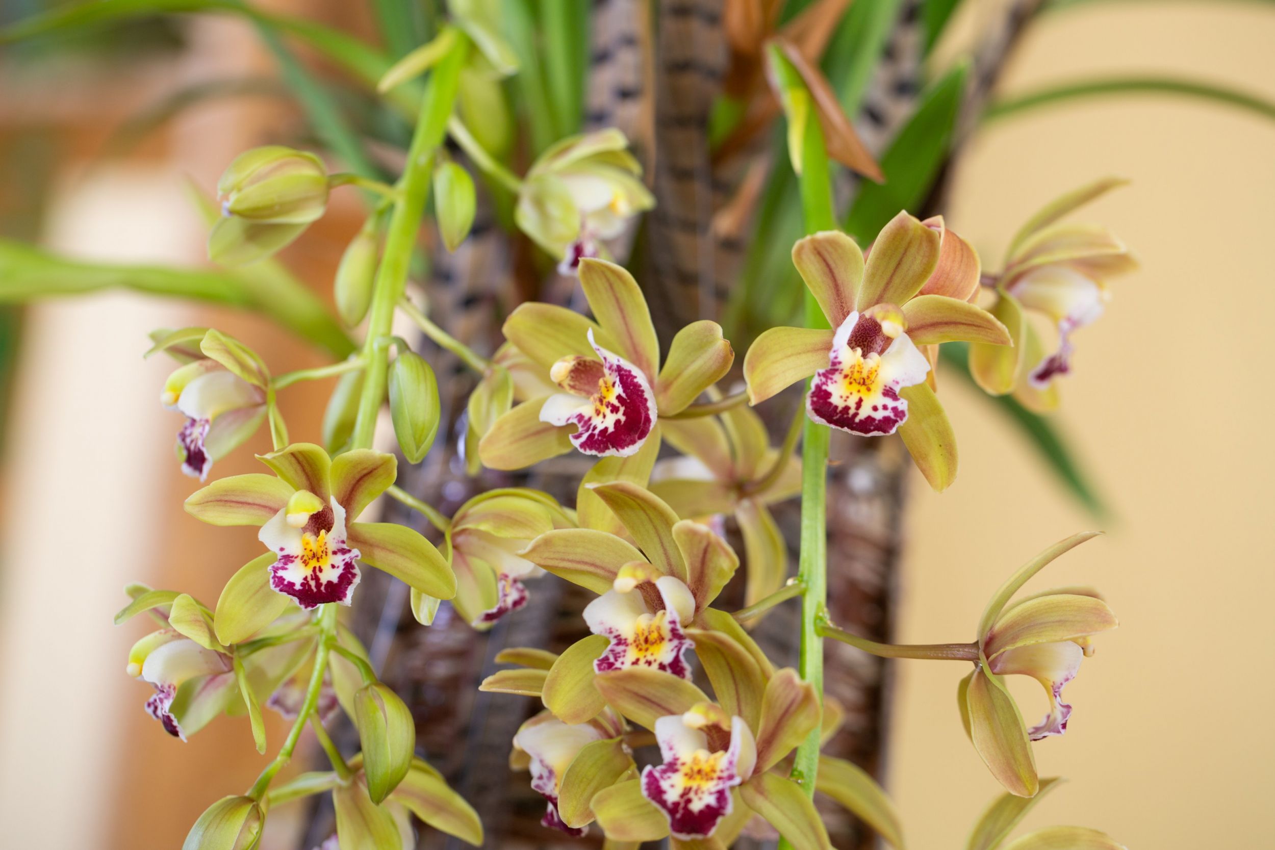 Roos van Unen made a fresh and natural plant arrangement with the Cascade Cymbidium 'Argiro' from LZ Orchidee which looks good in every interior. The plant is placed in a simple transparent vase with some driftwood on the bottom and pheasant feathers at the side, which creates a natural effect. The Cascade Cymbidium is a true jewel!