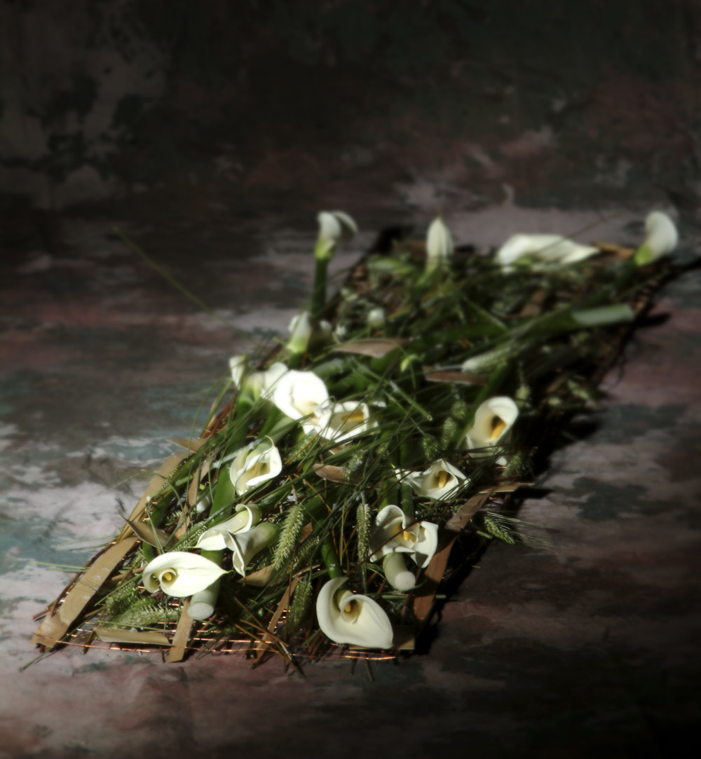 A harmonious arrangement combining unique materials such as copper mesh with grasses and white Zantedeschia.