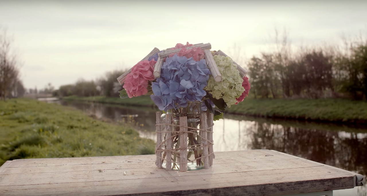 Pim van den Akker loves to work with Hydrangeas and got some beautiful varieties to work with, like the 'Verena', 'Pimpernel' and 'Rapsody'. He creates a big bouquet with them and adds a little twist with some dried sunflower stalks.