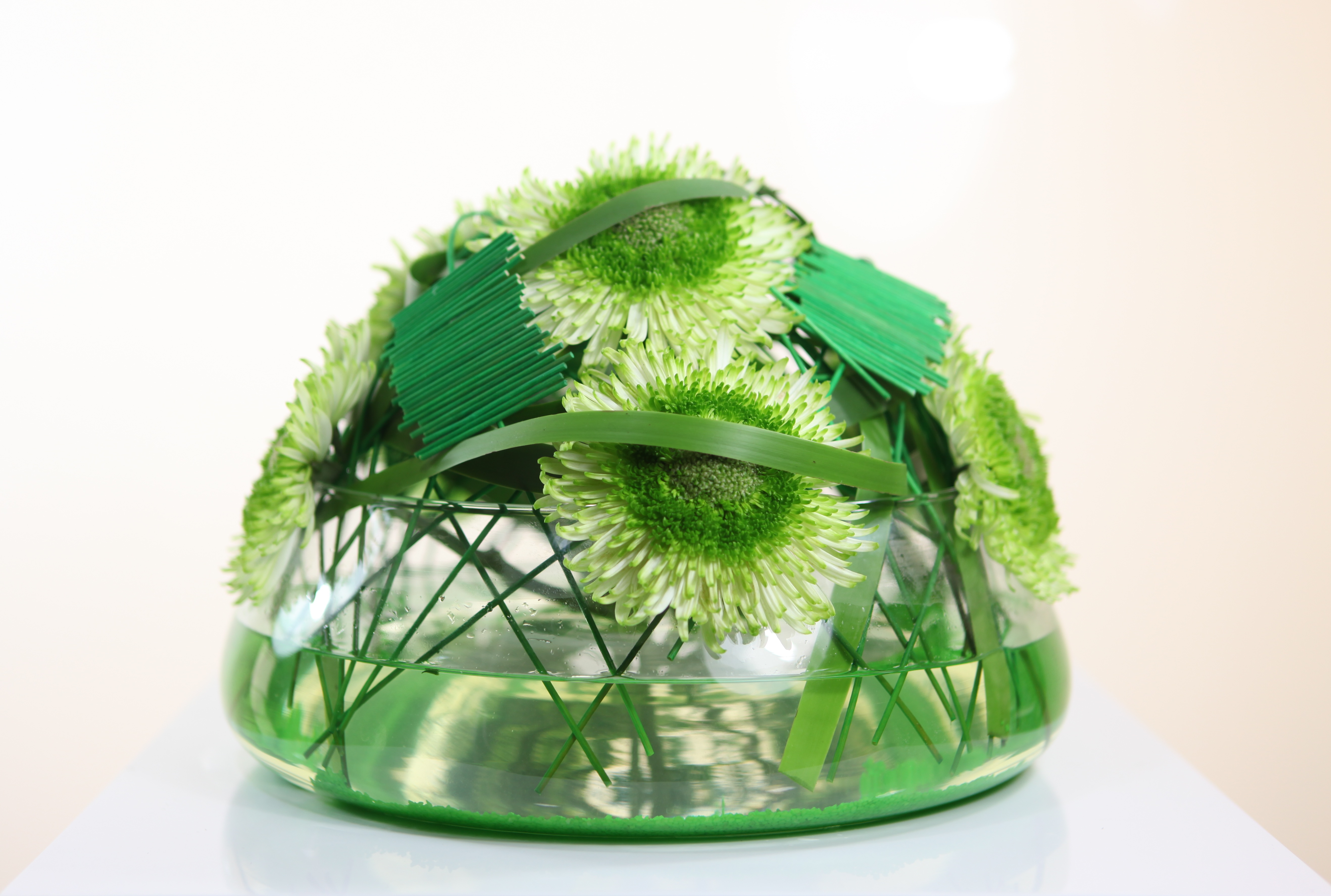 Het arrangement met gerbera's in het glas maakt de vorm compleet, als een soort deksel op een potje.