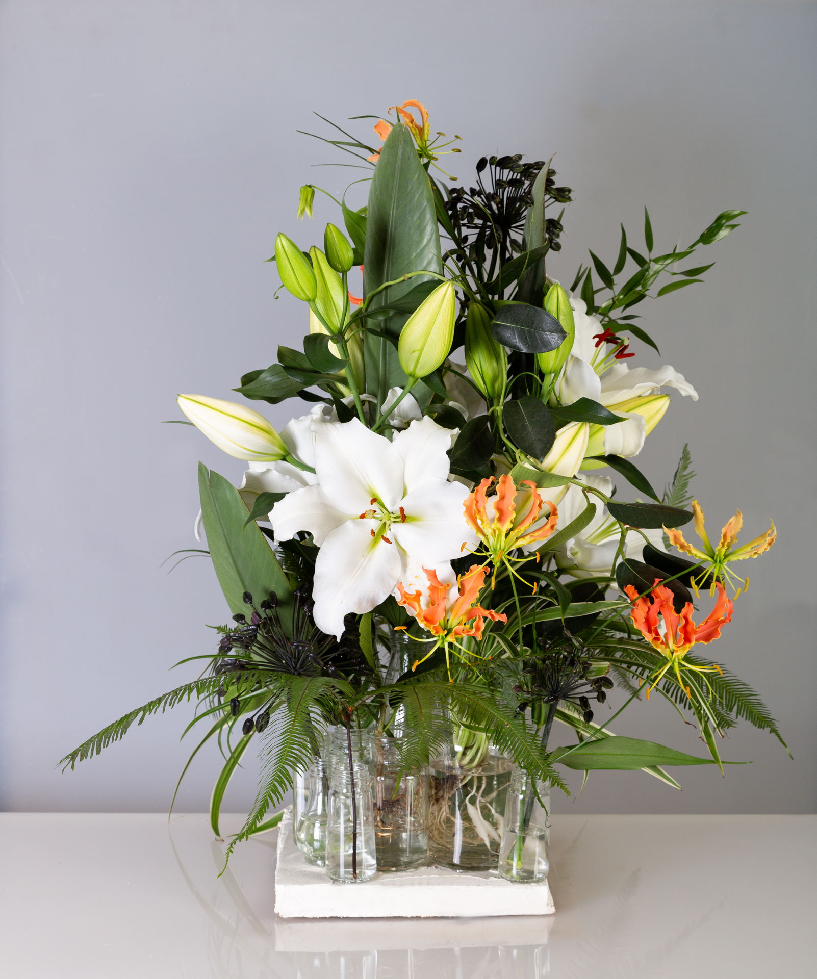 The wonderful white and odourless 'Tourega' lily from Royal Van Zanten shines as the centre of attention in this jungle arrangement by Dennis Lanzaat. A unique design in which he combines the serene white 'Tourega' lilies, various foliage and even plants as hydroponics. This large-headed oriental lily is the only one of its kind to be odourless, making it a perfect choice in arrangements for cafés, hotels and restaurants.