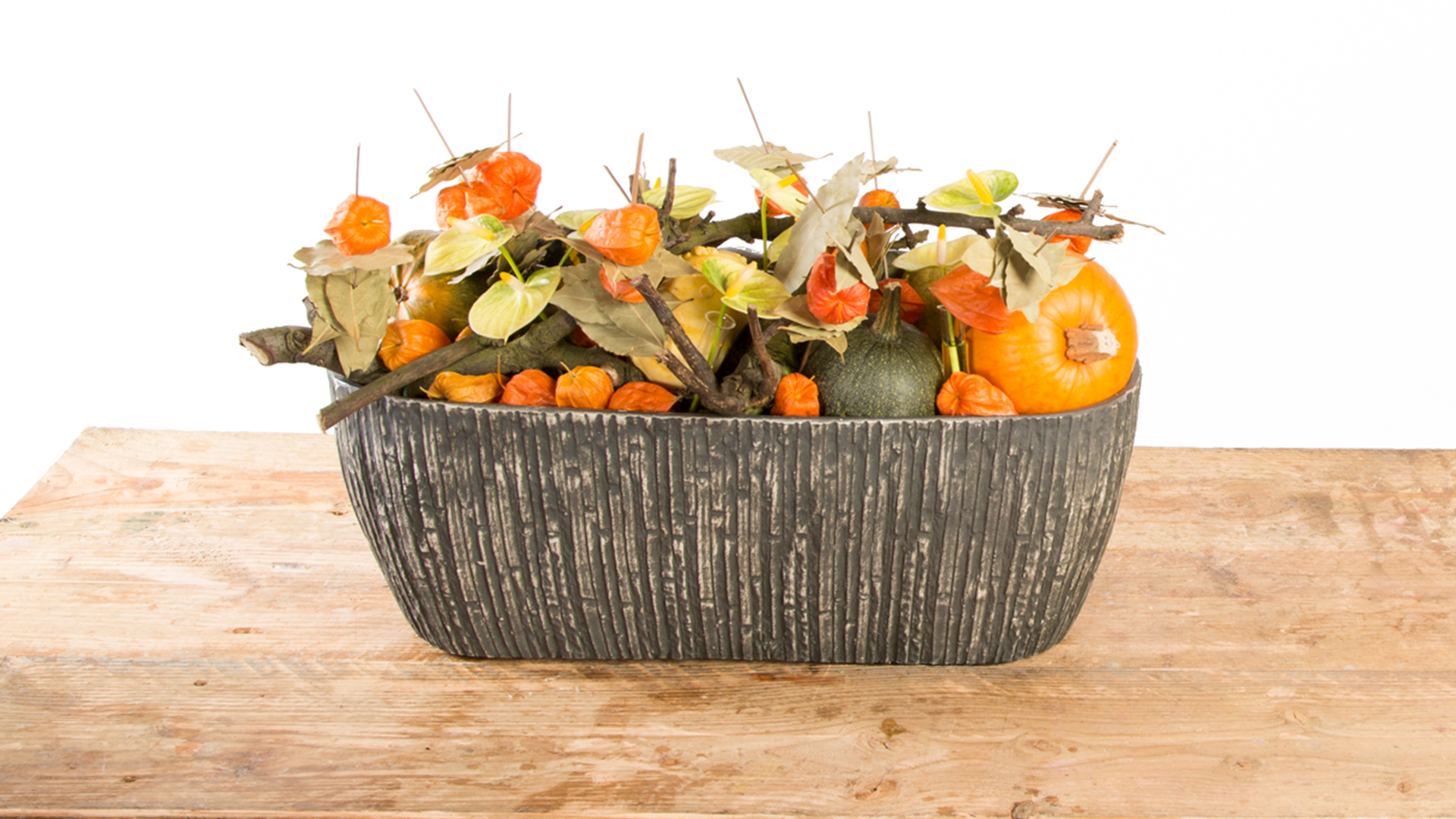 Alex Segura creates a natural style fall flower arrangement with pumpkins, Physalis and Anthuriums.