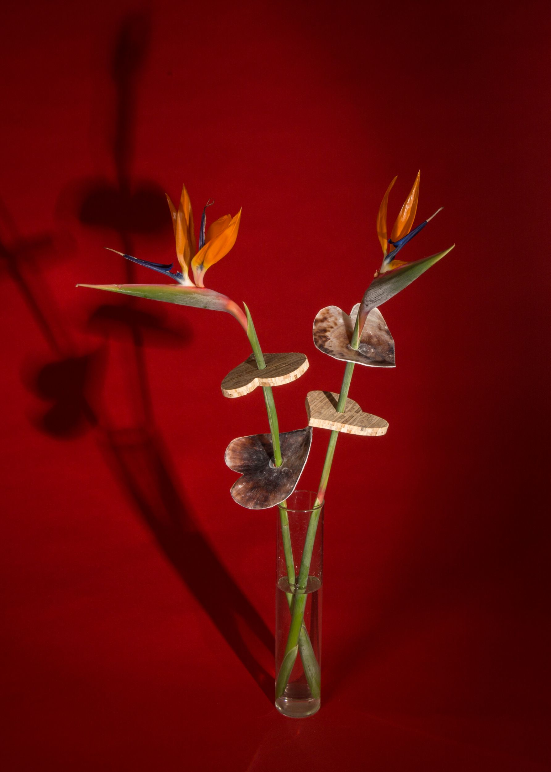 With the special Strelitzia (also called the Bird of Paradise flower) you give away an exotic feeling. Add some loving details in the shape of hearts from seashells and wood and you have created a simple, but a sweet gift for Valentine's Day!