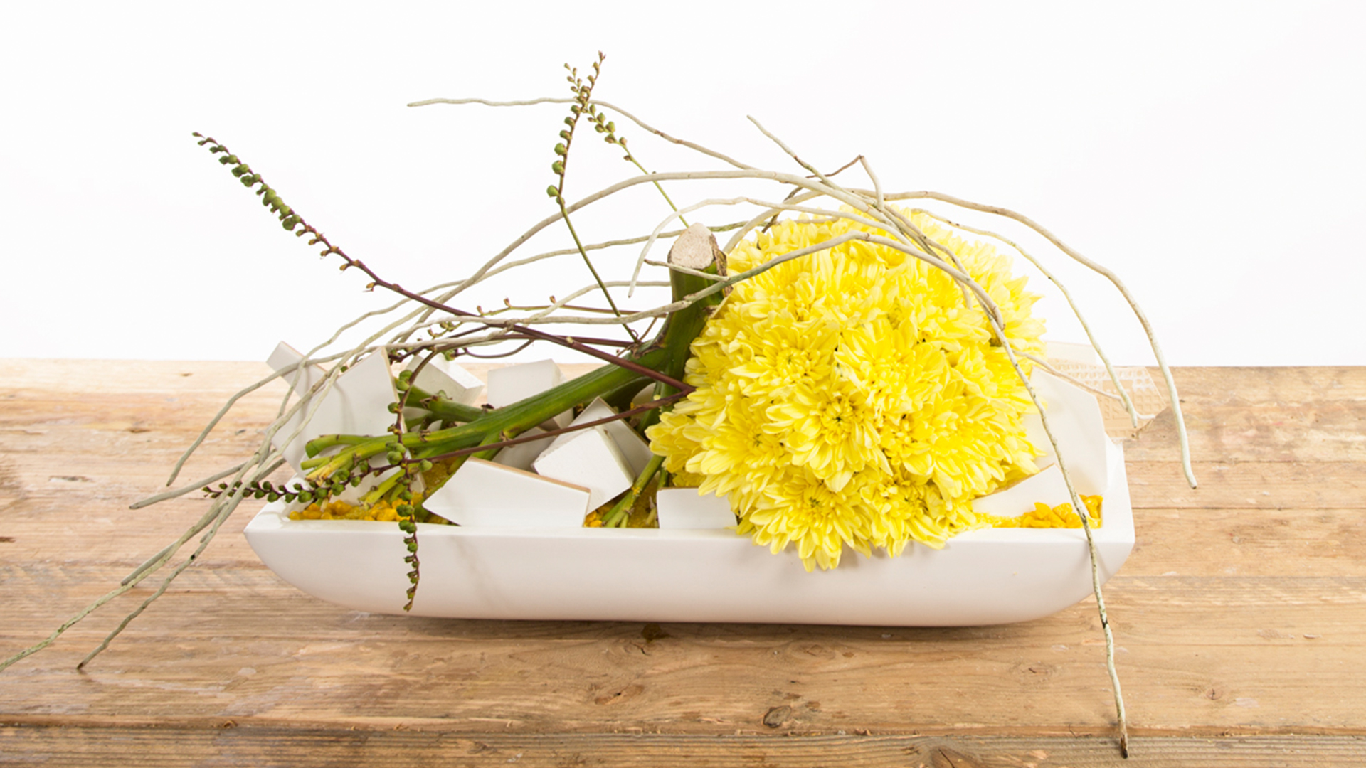Stylish flower arrangement with 'Baltica Yellow' Chrysantemums and broken tiles. Shards of pottery will do too ;o)
