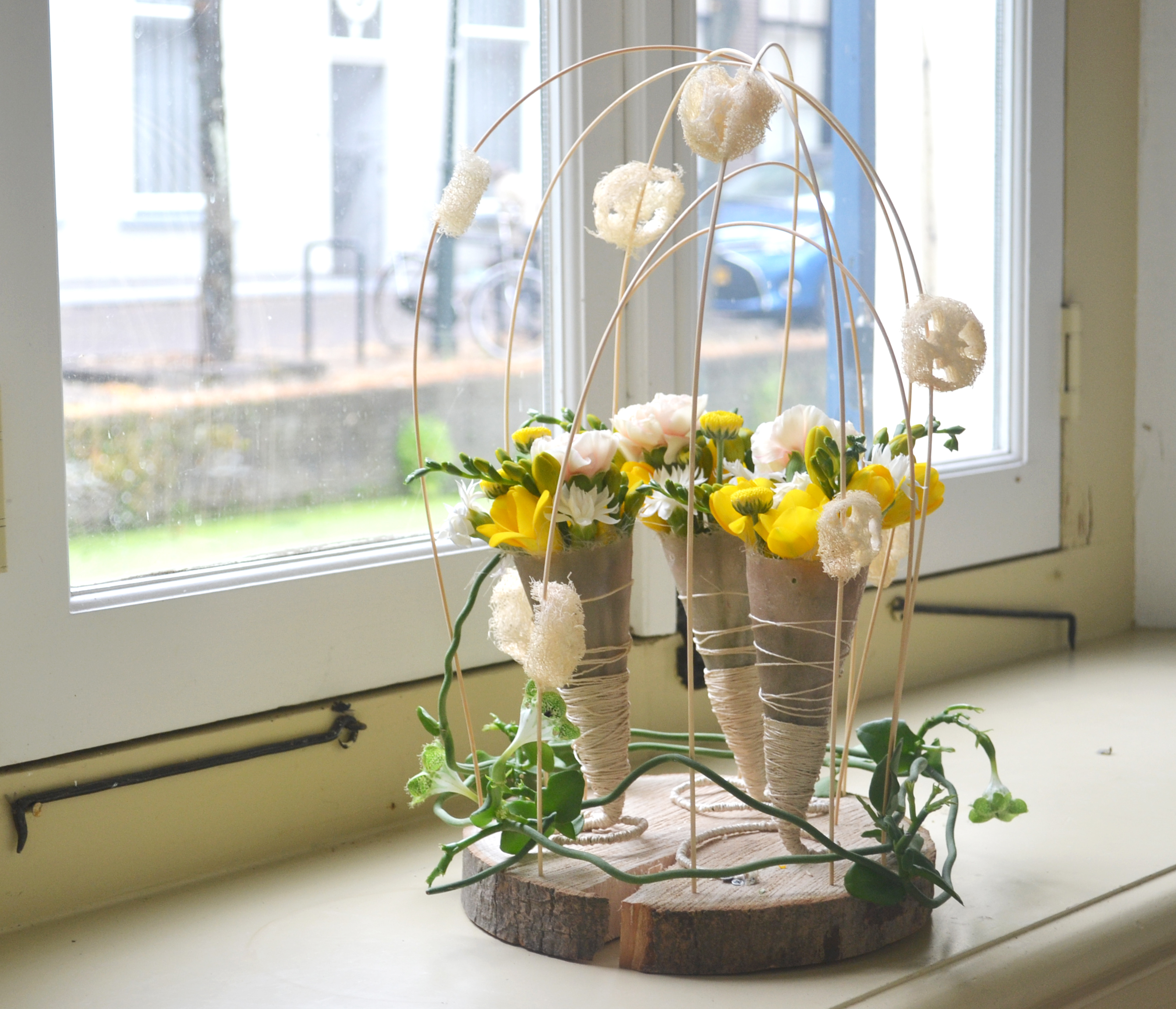 A very romantic design by Jantine van Bruggen Floral Designer. She used different materials like Chrysanthemums "Limoncello', Ceropegia African Fountain, Freesia 'Soleil', birch trunk and wicker.