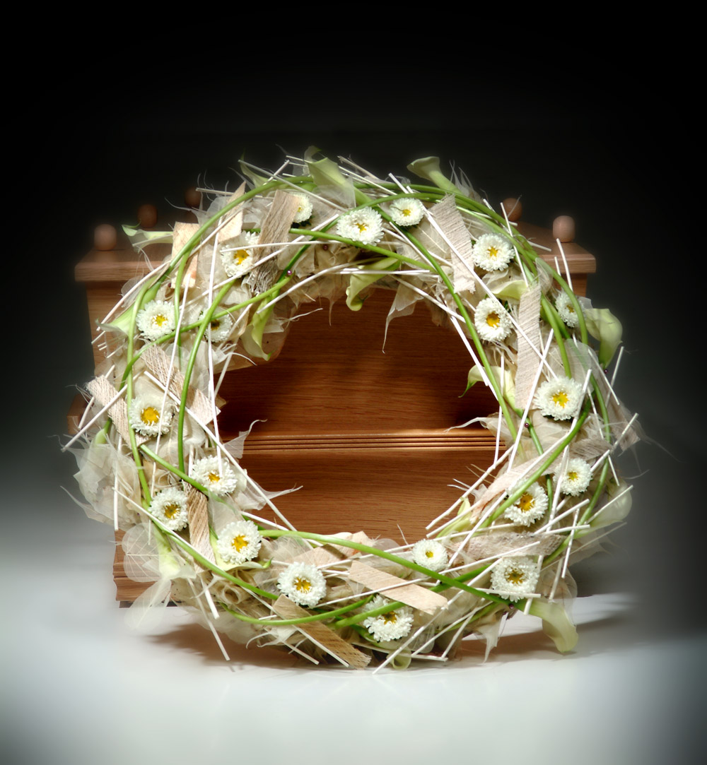 Beautiful light wreath with a transparent appearance due to use of fossil leaves. The wreath is playfully accented with calla lilies, with white asters functioning as points of tranquility.
