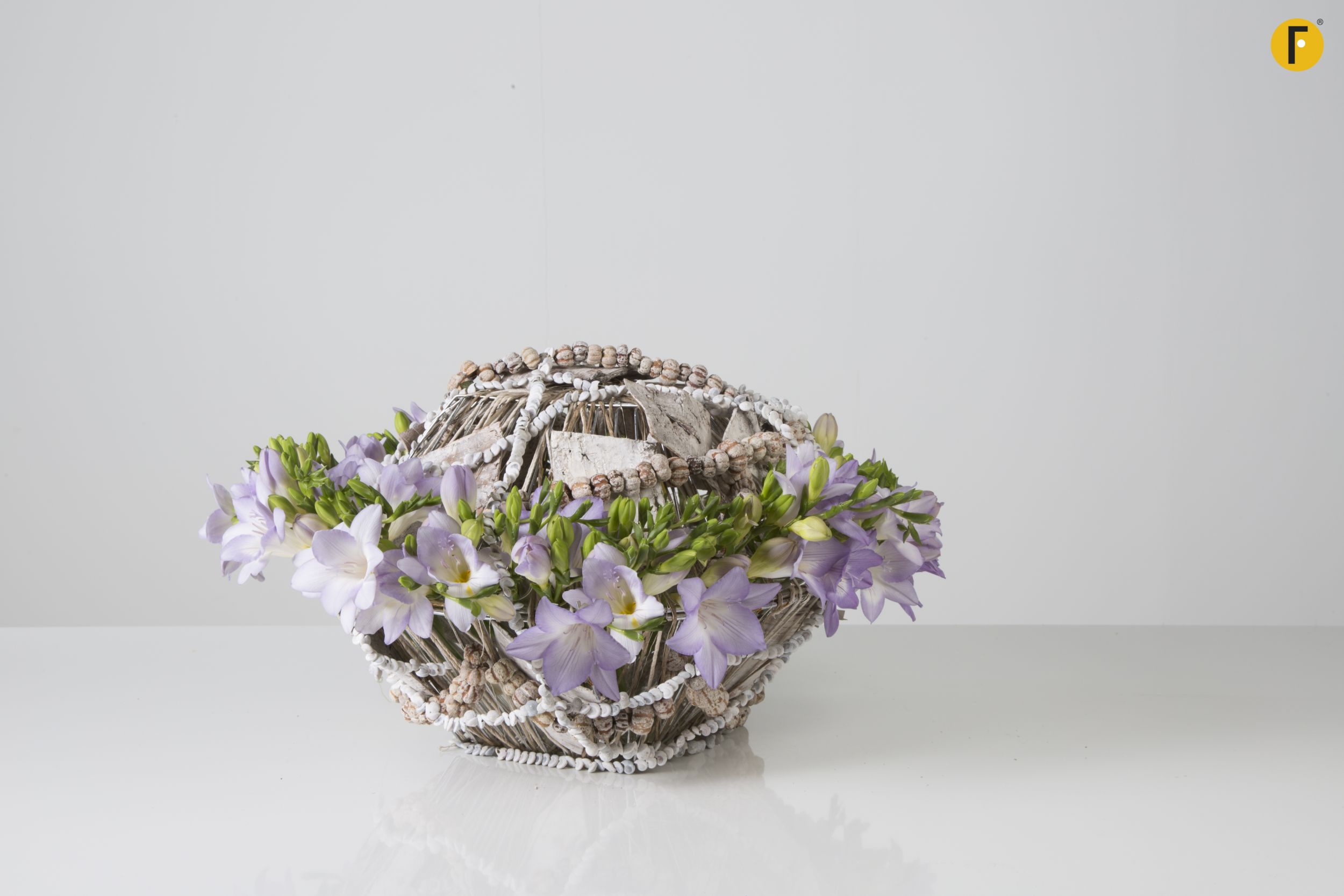 A cool example of upcycling in floristry: Roos van Unen created an object out of two old fruit bowls. She placed them on top of each other and connected them with wire and decorative strings of dried fruits and shells.