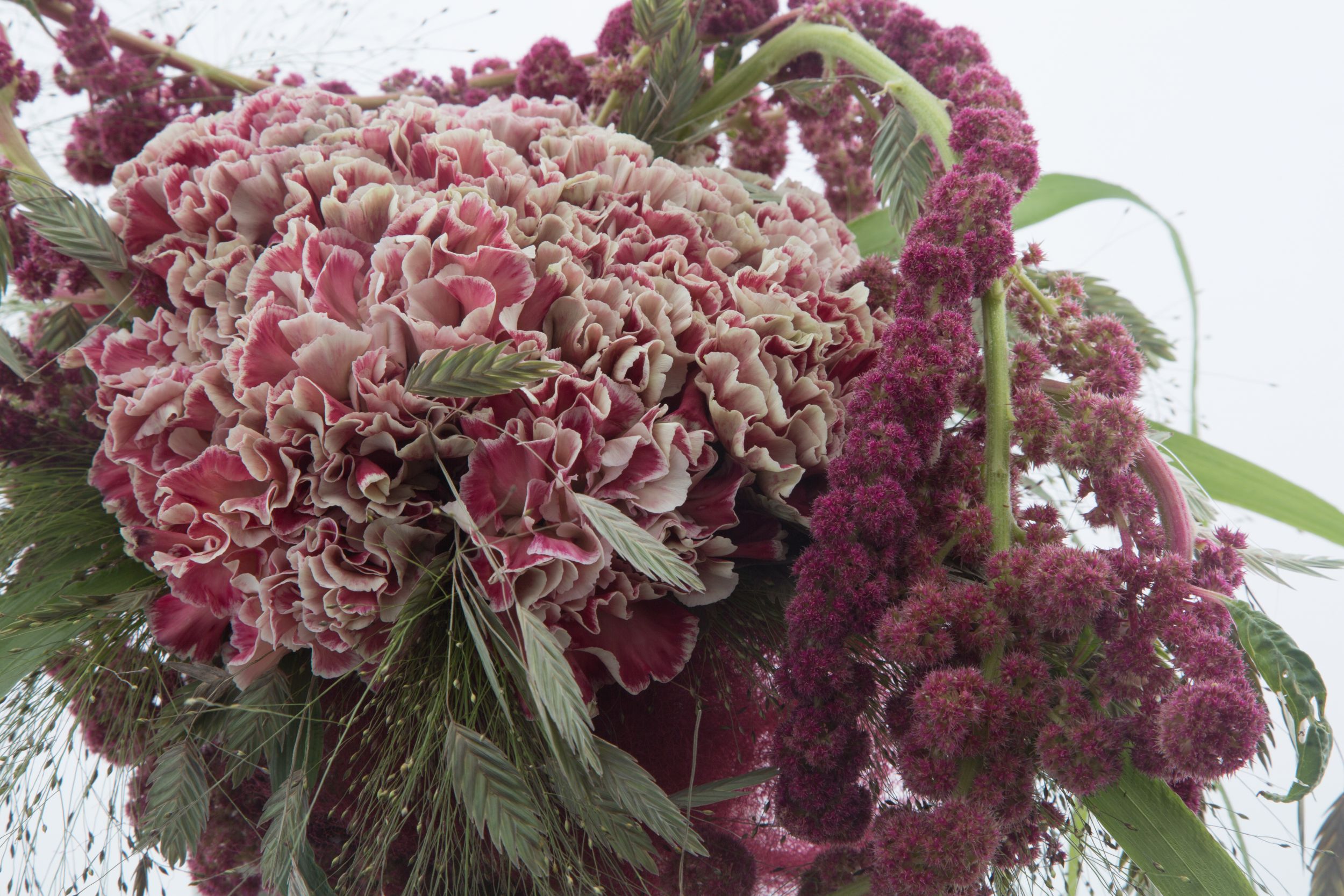 David Ragg has created a classic-looking bouquet in which the two-toned Dianthus from Trendy Dianthus is playing the leading role. The tightly-bound Dianthus gives the illusion that you are looking at one big Dianthus. The carnation, also called Dianthus, is wonderfully complemented by the trailing Amaranthus and the two kinds of grass which pop out: the Chasmanthium and Panicum virgatum. The choice of rustique materials and colours combined with the old-fashioned vase gives a vintage feel to the design.