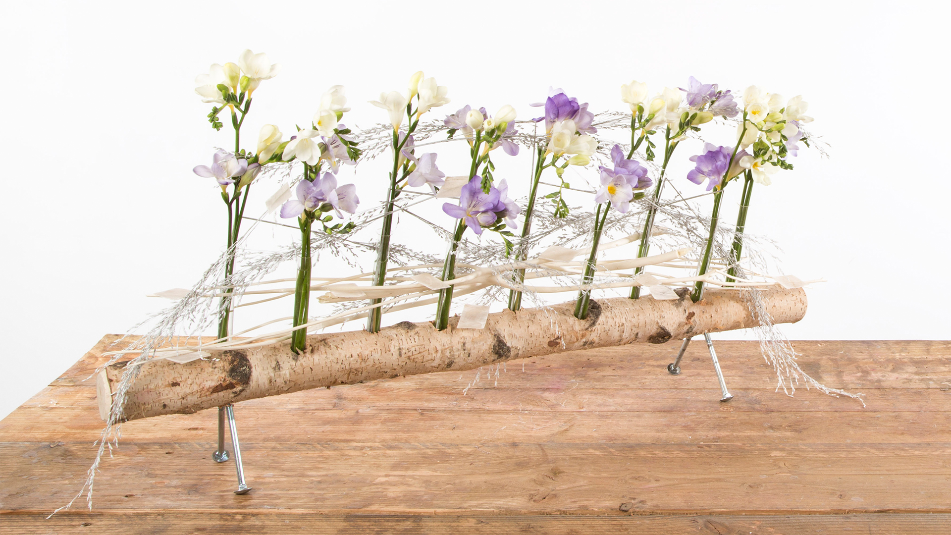 Pim van den Akker creates a wintery composition of out birch wood, grasses and beautifully smelling Freesias.