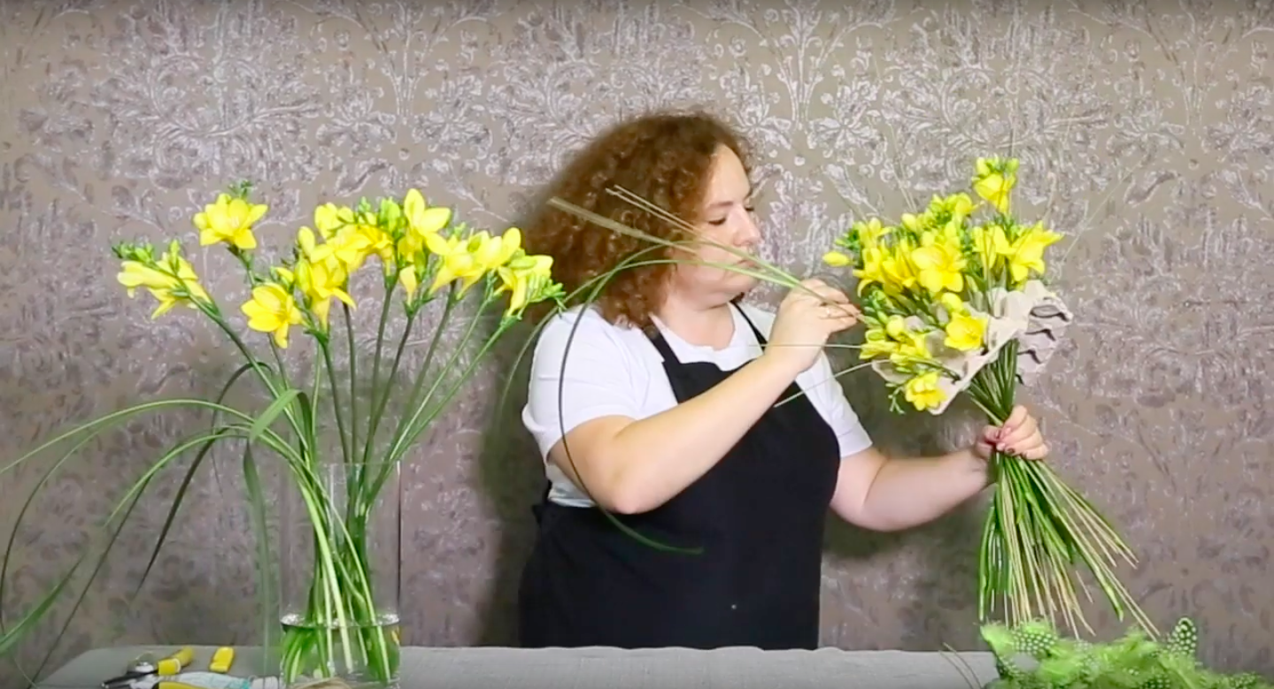 Galina Kharitonova maakte een uitbundig #FreestyleFreesia boeket tijdens Fleuramour 2019. Ze recycled een eierdoos, gebruikt deze als frame en versiert deze met veertjes. Eenvoud maar het laat de knalgele Freesia's op een geweldig leuke manier eruit springen!