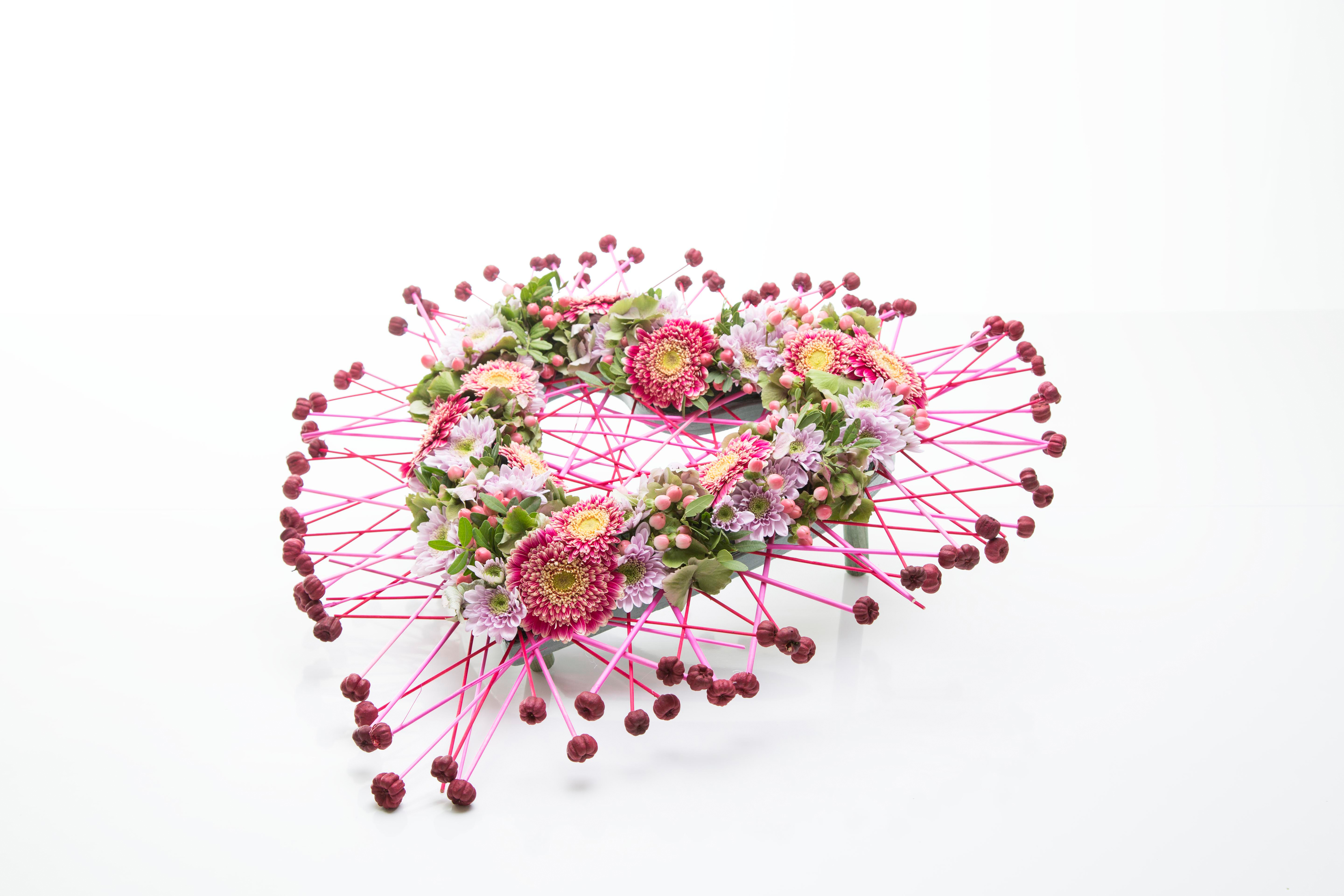 Hoe beter een overledenen te eren dan met een afscheidsbloemwerk in de vorm van een hart. Alex Segura gebruikt hartvormig steekschuim van Oasis en verwerkt hierin de gerbera's ‘Selfie’, chrysanten 'Belicia Pink’, hortensia, hypericum, pistache blad en gedroogde bessen.
