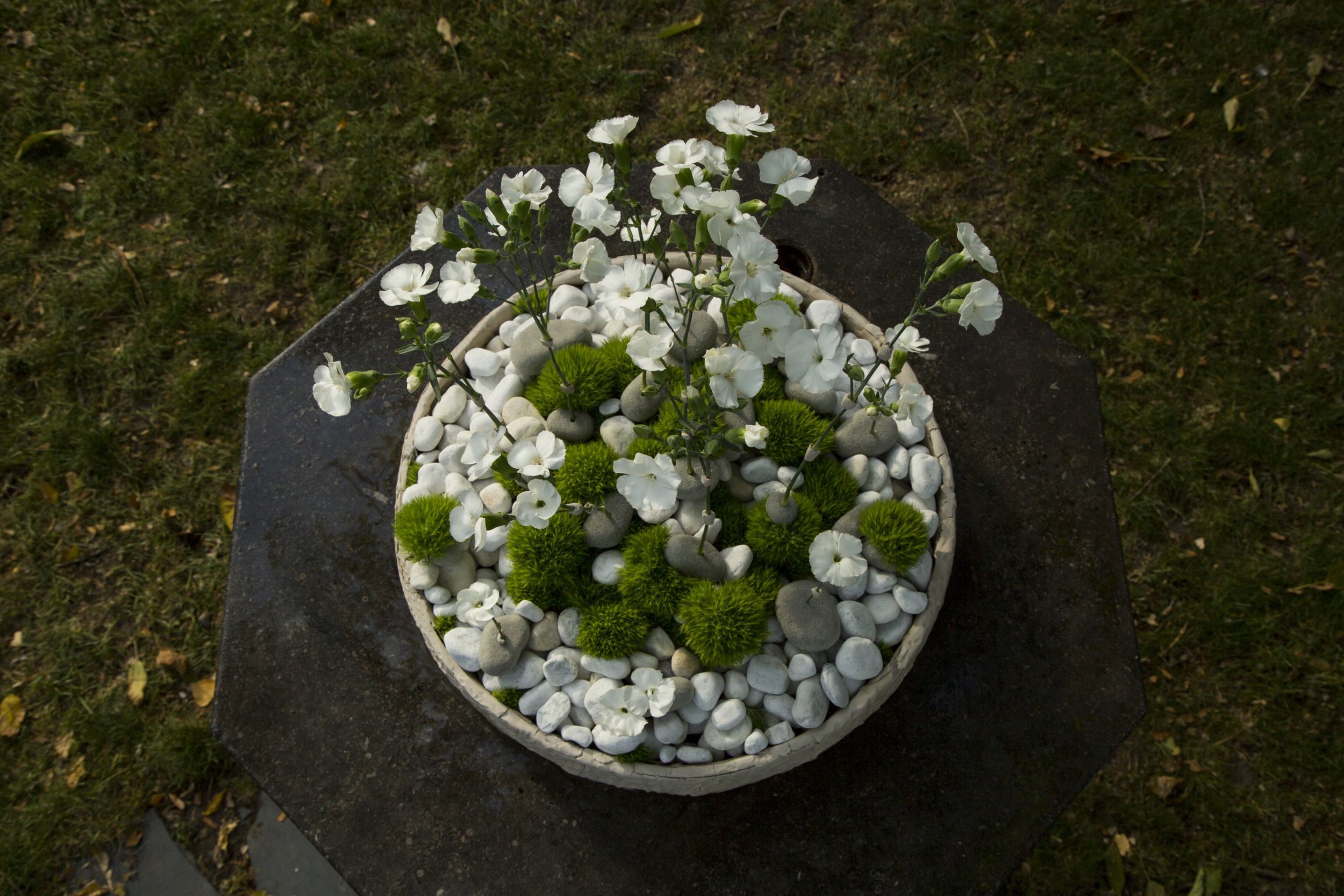 Idee voor afscheidsbloemwerk met de groene Sparkz® Dianthus 'Green Trick' en de Solomio® 'Ard' van HilverdaKooij. Roos van Unen maakte een basis van een schaal die ze bekleedde met klei en vulde met steekschuim. De Green Trick lijkt op mos en werkt daarom mooi laag gestoken in het bloemwerk. De spierwitte Solomio® 'Ard' is gestoken in OASIS 'pebbles' en torent er op een speelse manier bovenuit. Een origineel en ingetogen afscheidsbloemwerk.