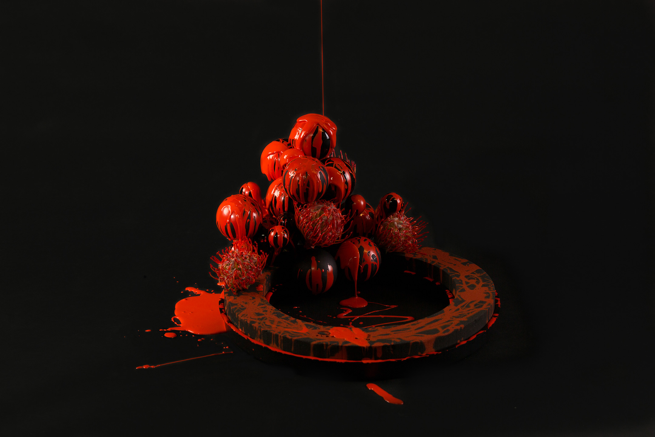 Roos van Unen gebruikte een ring van zwart steekschuim van OASIS om een gaaf en alternatief kerstbloemwerk te maken. Het Black Ideal steekschuim is gaaf om te laten zien en nodigt uit tot creatieve uitspattingen. Roos van Unen stapelde zwarte kerstballen op elkaar en plaatste hier Leucospermum tussen. Vervolgend overgoot zij het stuk met knalrode verf wat resulteerde in een stoer bloemwerk!
