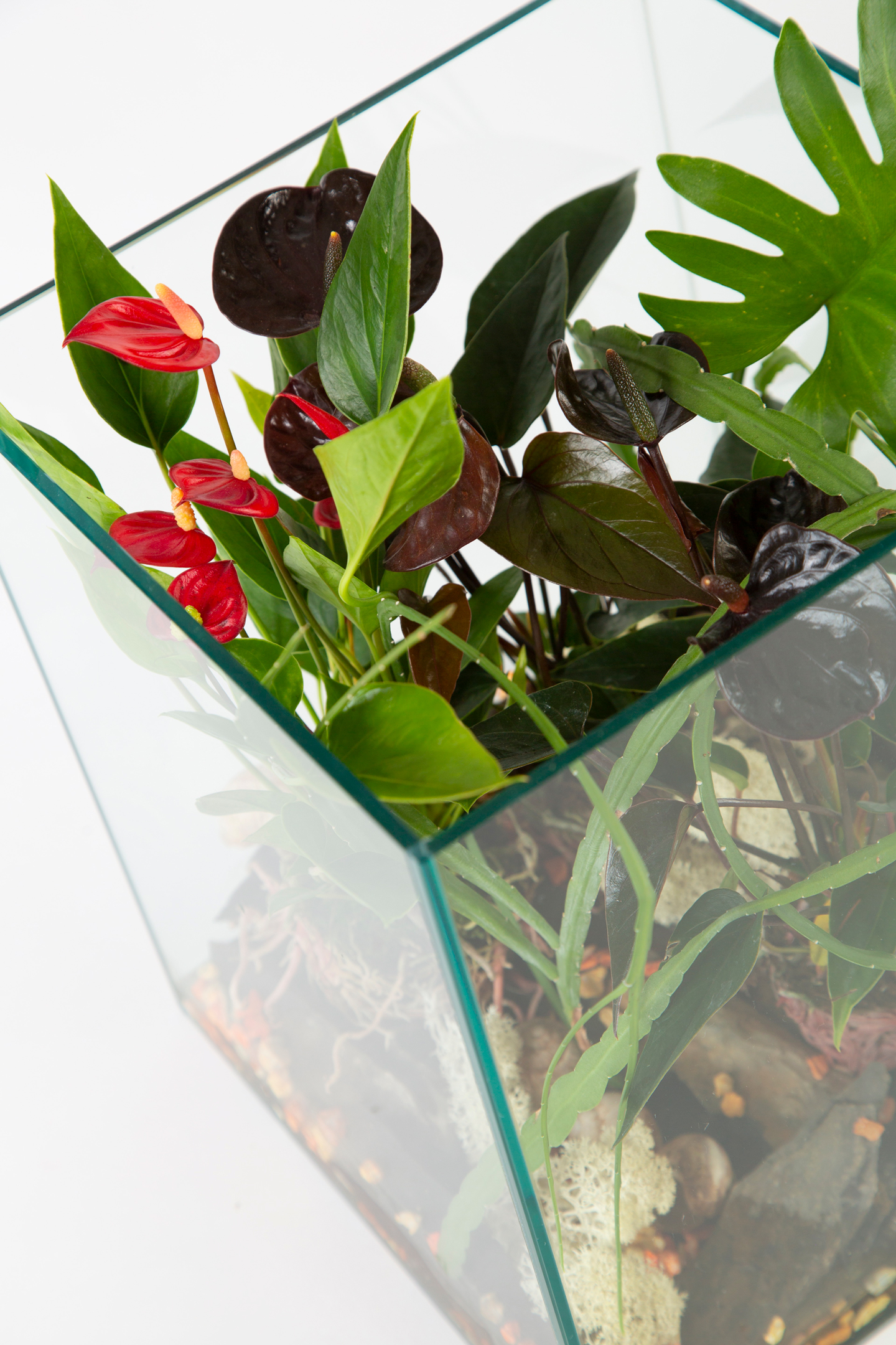 Planten achter of onder glas zijn populair! Roos van Unen maakt dit fraaie terrarium met Anthurium planten, die hier uitermate geschikt voor zijn. Het geheel doet denken aan een klein landschap. Meer ideeën voor plantenarrangementen met Anthuriums kun je terugkijken in deze video met Pim en Roos op Facebook!