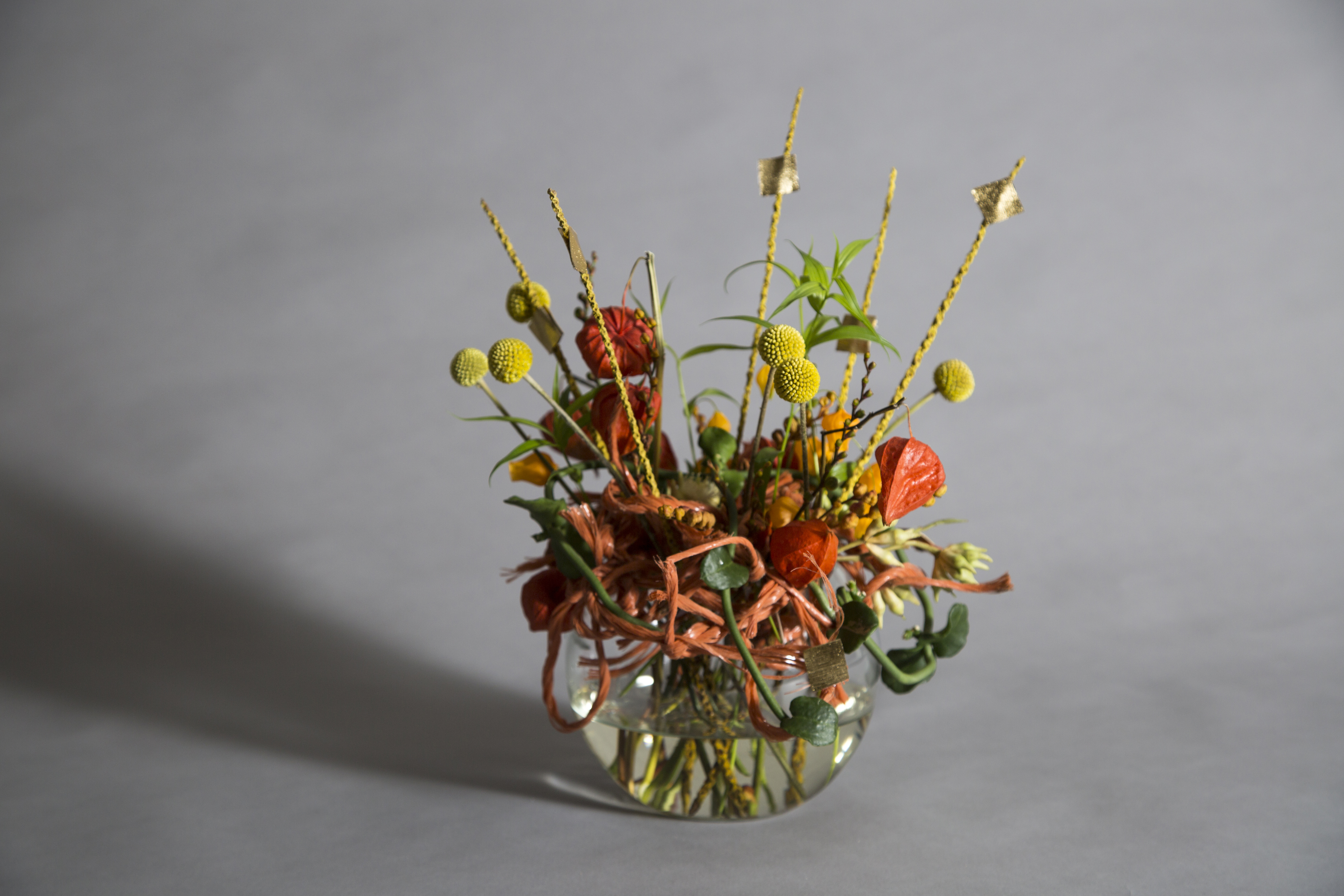 Prachtige goudtinten in dit design van Roos van Unen. Ze gebruikte Craspedia, Physalis, Ceropegia en Sandersonia en kleine gouden details.