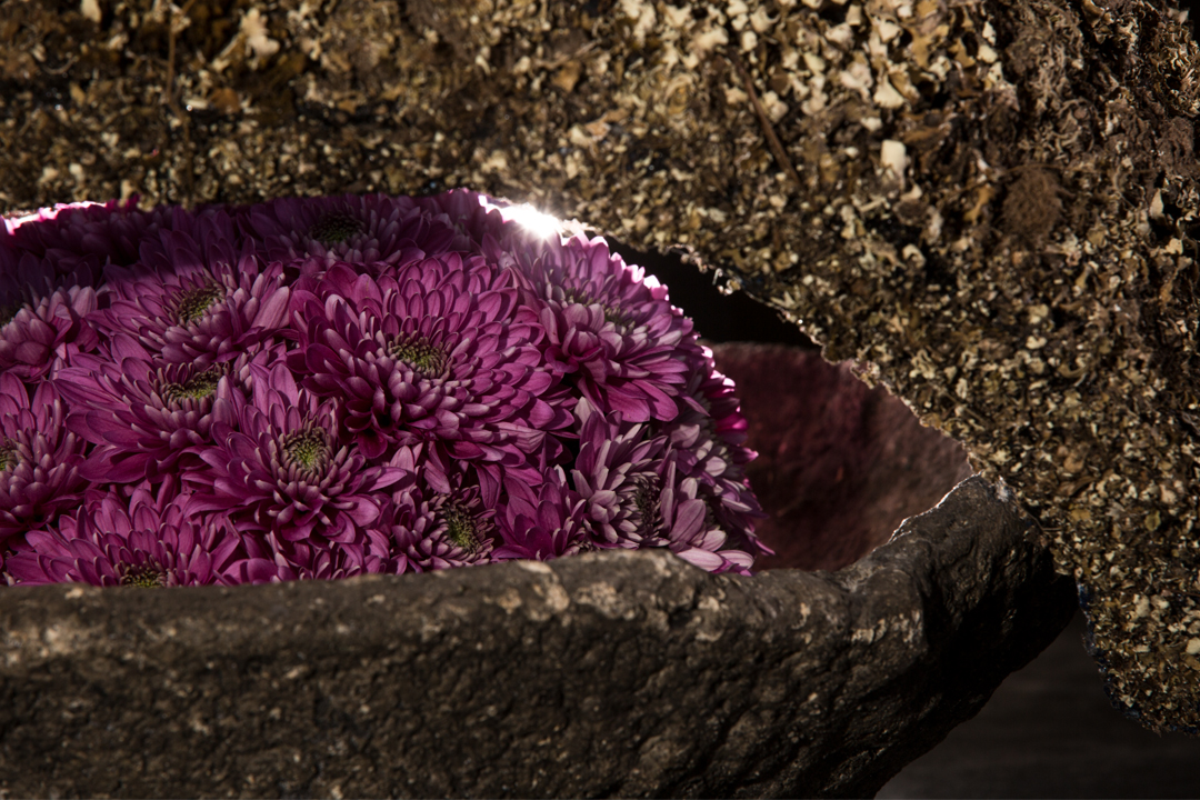 Als een goed verborgen schat... Dit bloemwerk met floraal juweel 'Romance Purple' voelt wat mysterieus maar het is geen geheim dat de chrysanten van Zentoo zowel mooi als ijzersterk zijn. Roos van Unen vertaalde deze twee eigenschappen in dit design dat doet denken aan een grote oester die waakt over zijn parel. De 'schelp' is gemaakt van een basis van klei die bedekt is met vermalen mos. De Romance Purple bloemen zijn kort gesneden en gestoken in een halve bol steekschuim.