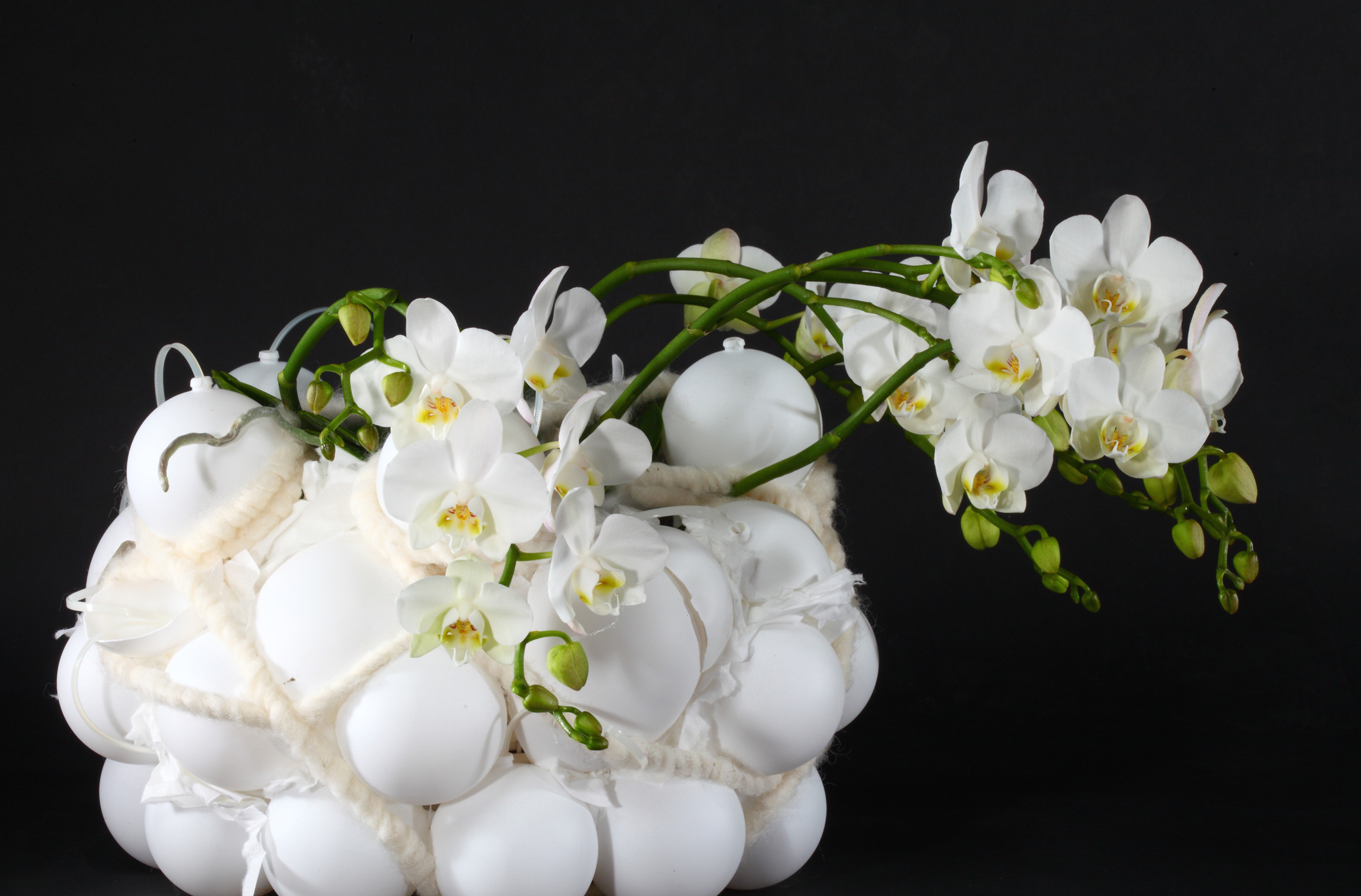 Lots of frosted white Christmas balls have been glued together to create a container for a beautiful white orchid. Strings of wool are knotted around the Christmas balls to serve as extra support and a nice detail. Simply elegant!