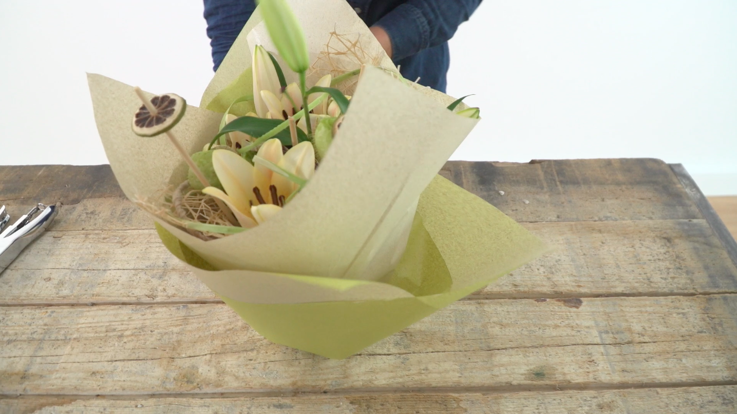 Als je duurzaam wilt werken, dan is het fijn dat je milieuvriendelijke bloemisterij-artikelen kunt bestellen zoals het graspapier van Dillewijn Zwapak. Roos van Unen laat een idee zien voor een bloemwerk wat ze mooi verpakt in dit graspapier. Leuk detail: het papier ruikt nog heerlijk naar gedroogd gras!