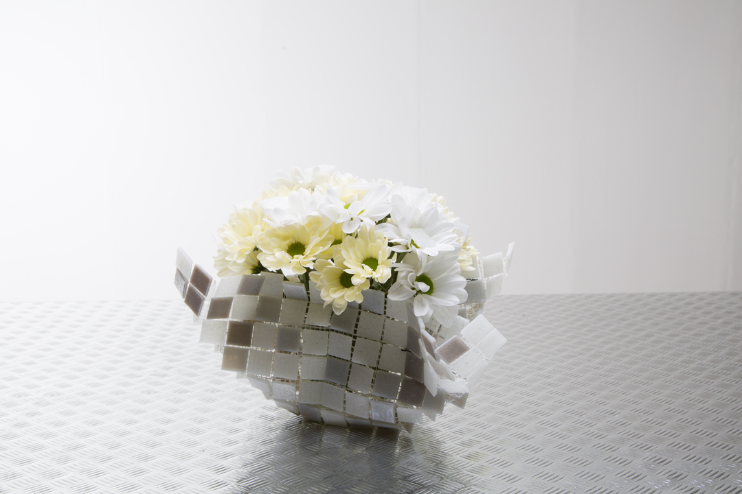 Pim van den Akker creëerde een basis van mozaïek tegeltjes die hij om een glazen vaas bevestigde. Dit design is een afgeleide van het doe-het-zelf moodboard voor Zentoo.