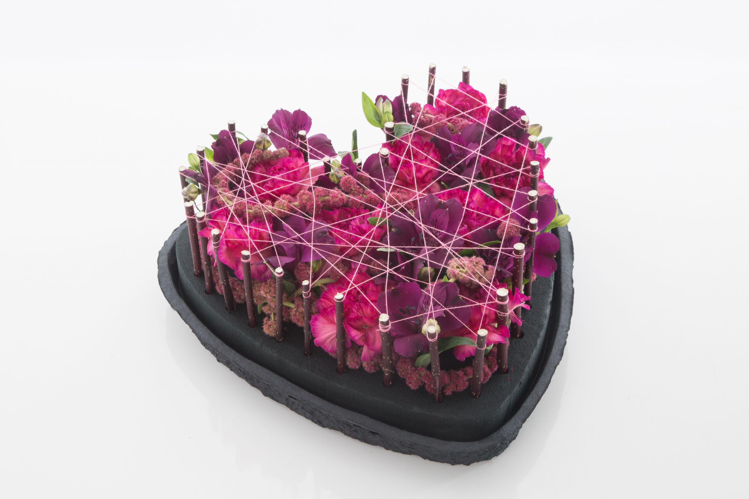 Met deze hartvormige OASIS® Black Ideal maakt Roos van Unen een mooi hart voor Valentijn. De diversiteit van de prachtige Anjers en Alstroemeria in dieprood, roze en paars tinten, gecombineerd met het zwarte steekschuim, zorgt voor extra diepte. Het gespannen draad zorgt voor een strakke beweging in het design. De amaranthus onder het draad gedrapeerd creëert een zwoele beweging. De combinatie van strakke lijnen, sensuele golfbewegingen en de diepe kleuren zorgen voor een passioneel Valentijnsbloemstuk.