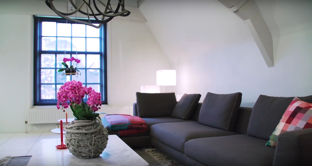 Een strakke woonkamer met rijkelijk bloeiende orchideeën is een prachtige combinatie. Hier zijn de 'Bellissimo' en 'Grandi' gebruikt in designs van Pim van den Akker om de ruimte een flinke kleurinjectie te geven.