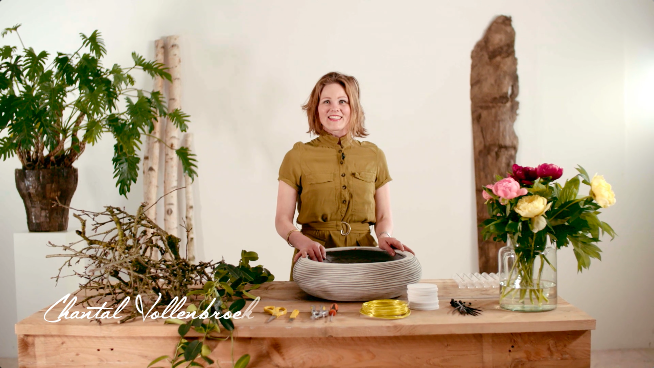 Chantal Vollenbroek deelt een idee voor een prachtig tafelstuk met pioenen. Ze maakt een originele en stevige basis van appeltakken voor de pioenen 'Bartzella', 'Sarah Bernhard' en 'Red Charme'.