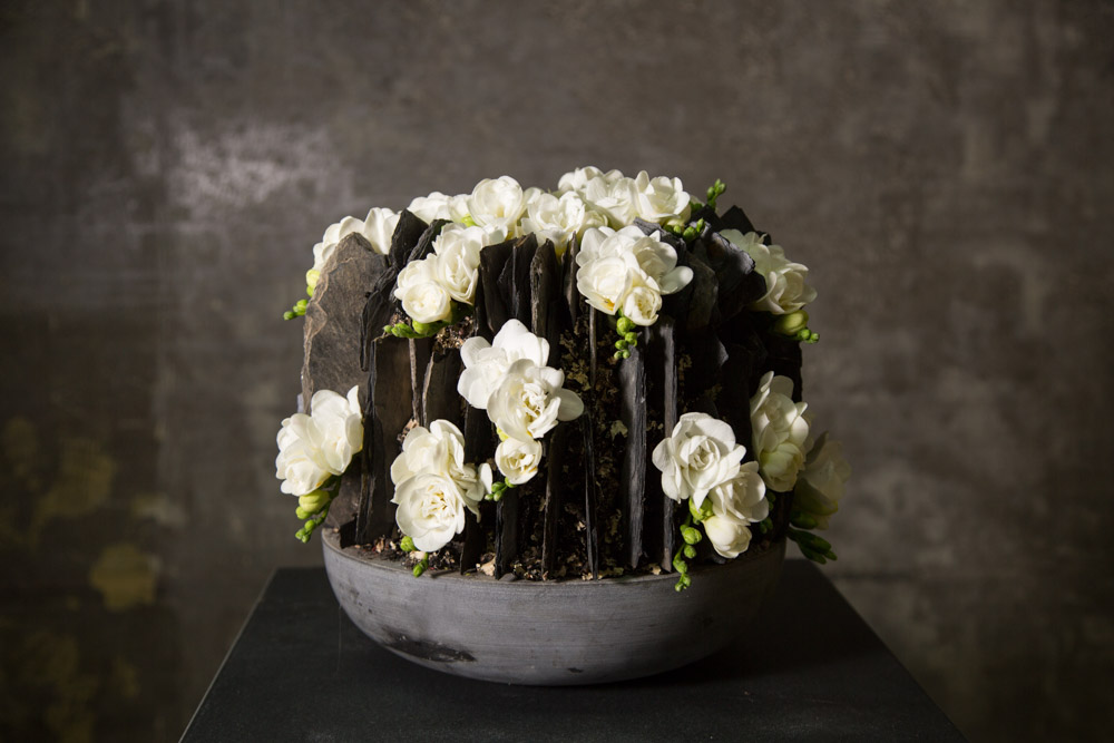 In dit Freesia design laat Pim van den Akker zien dat deze schoonheid ook goed te gebruiken is in een eerbiedig rouwarrangement. In droog steekschuim worden leistenen en buisjes gestoken. Het object wordt op een schaal geplaatst en afgewerkt met korstmossen. Het steekschuim wordt niet vochtig gemaakt zodat het object meerdere malen gebruikt kan worden. De buisjes worden gevuld met water en witte Freesia. Door de serene witte Freesia te combineren met het grijze, natuurlijke leisteen, krijgt het ontwerp een eerbiedige en gewichtige uitstraling.